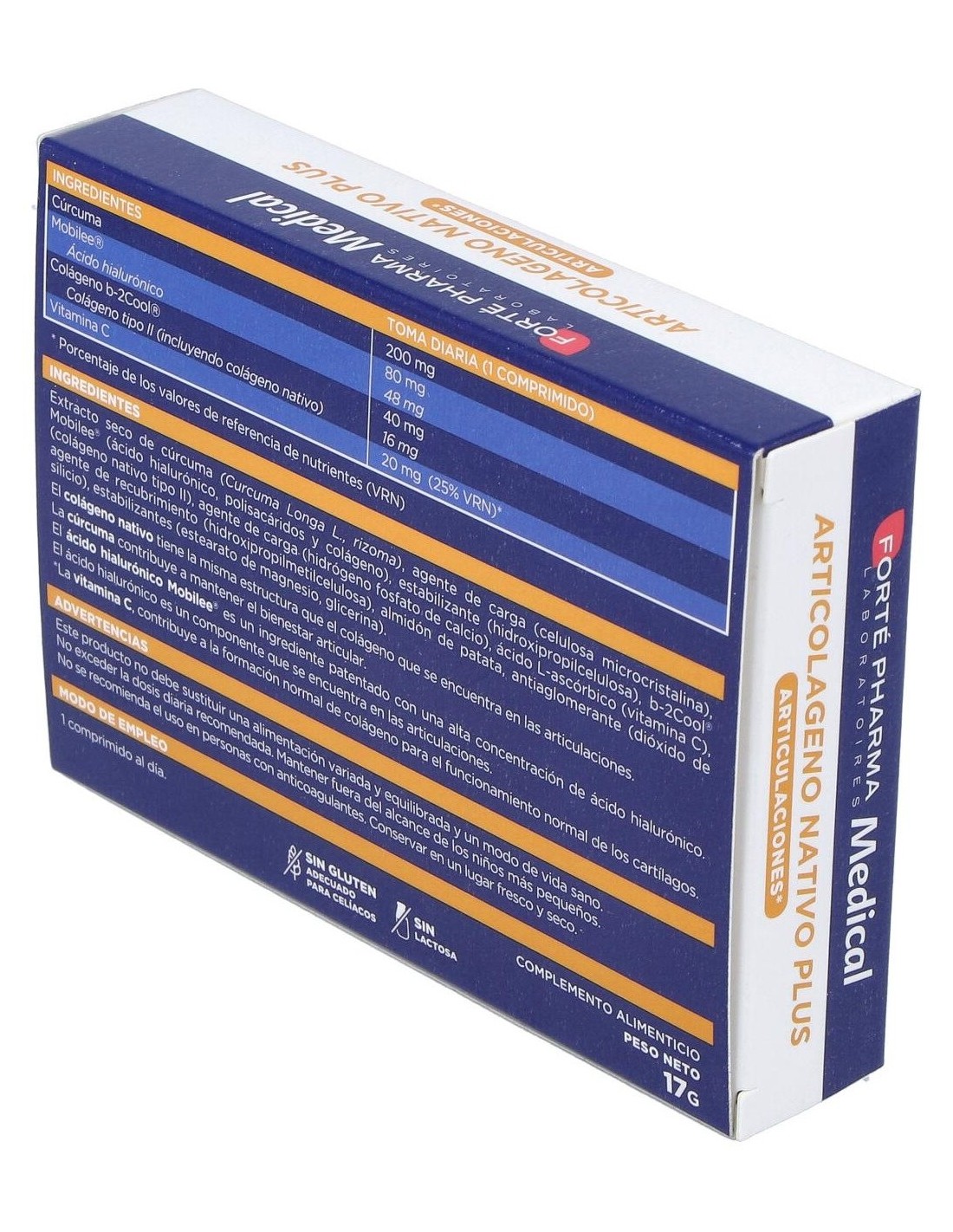 FORTE PHARMAFórmula con colágeno nativo y otros nutrientes que sirven de apoyo al mantenimiento de las articulaciones en condiciones normales. Producto apto para celíacos.