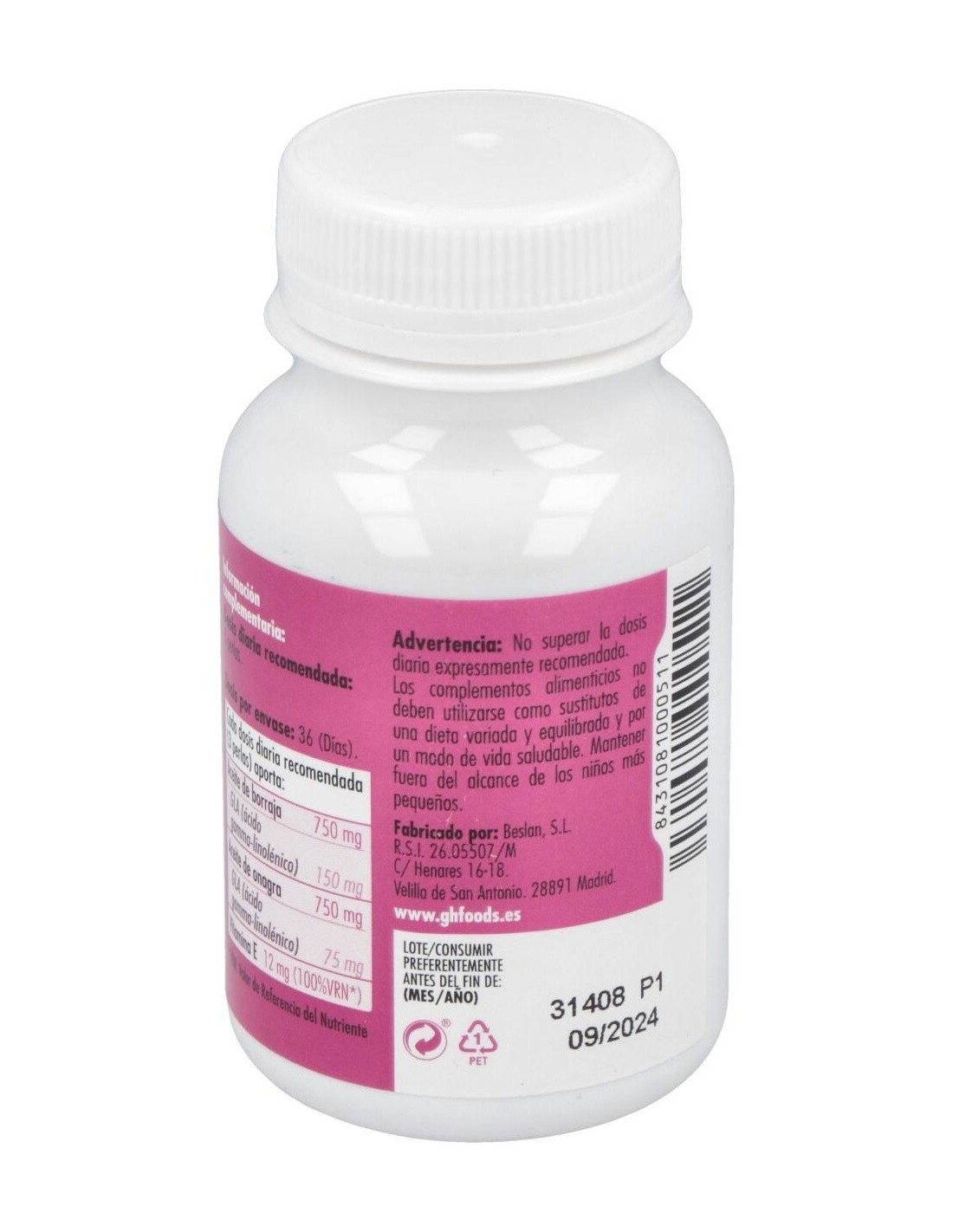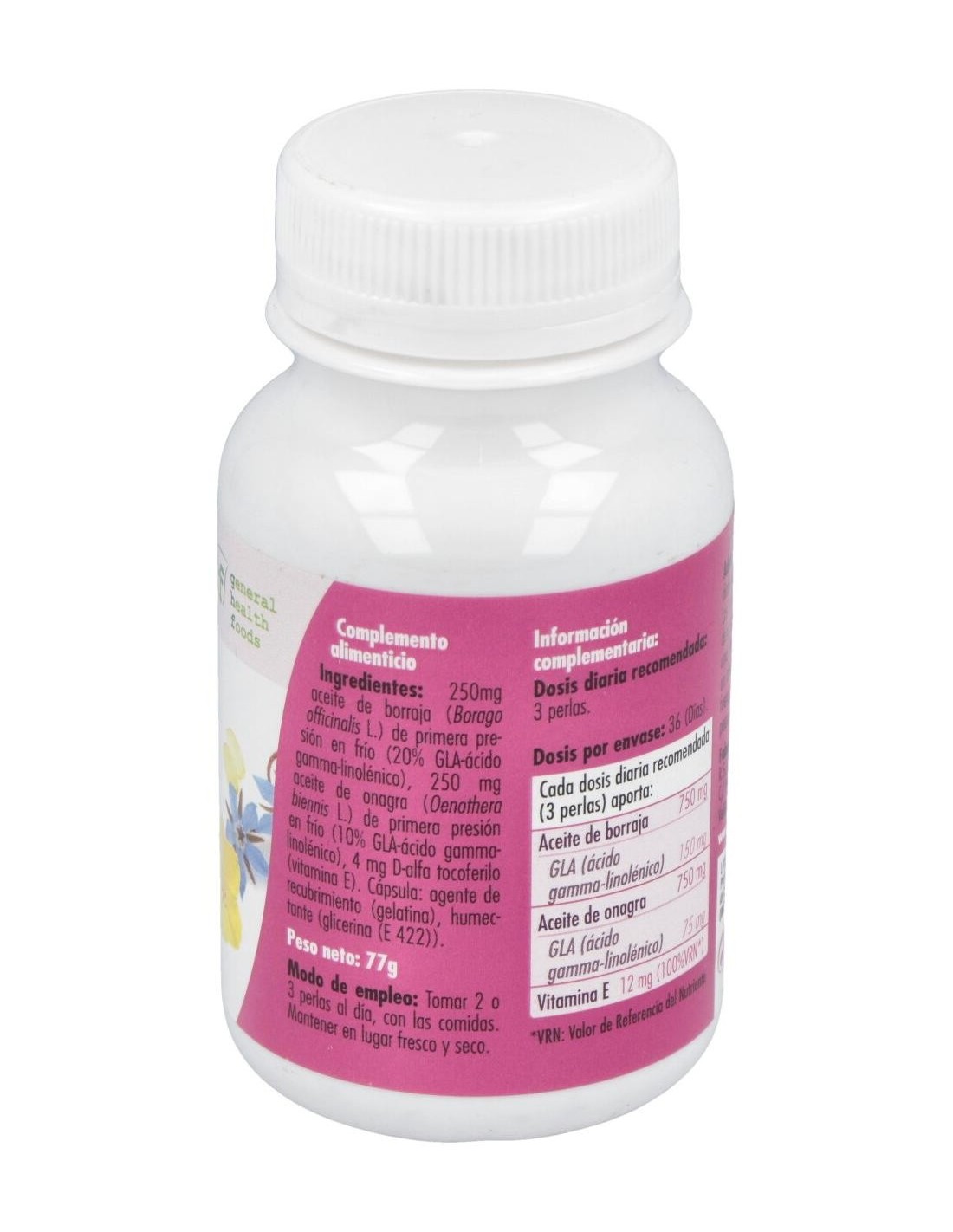 - Contiene 500 mg por perla de aceite de onagra y borraja, que contribuyen a la ingesta equilibrada de ácidos grasos omega.