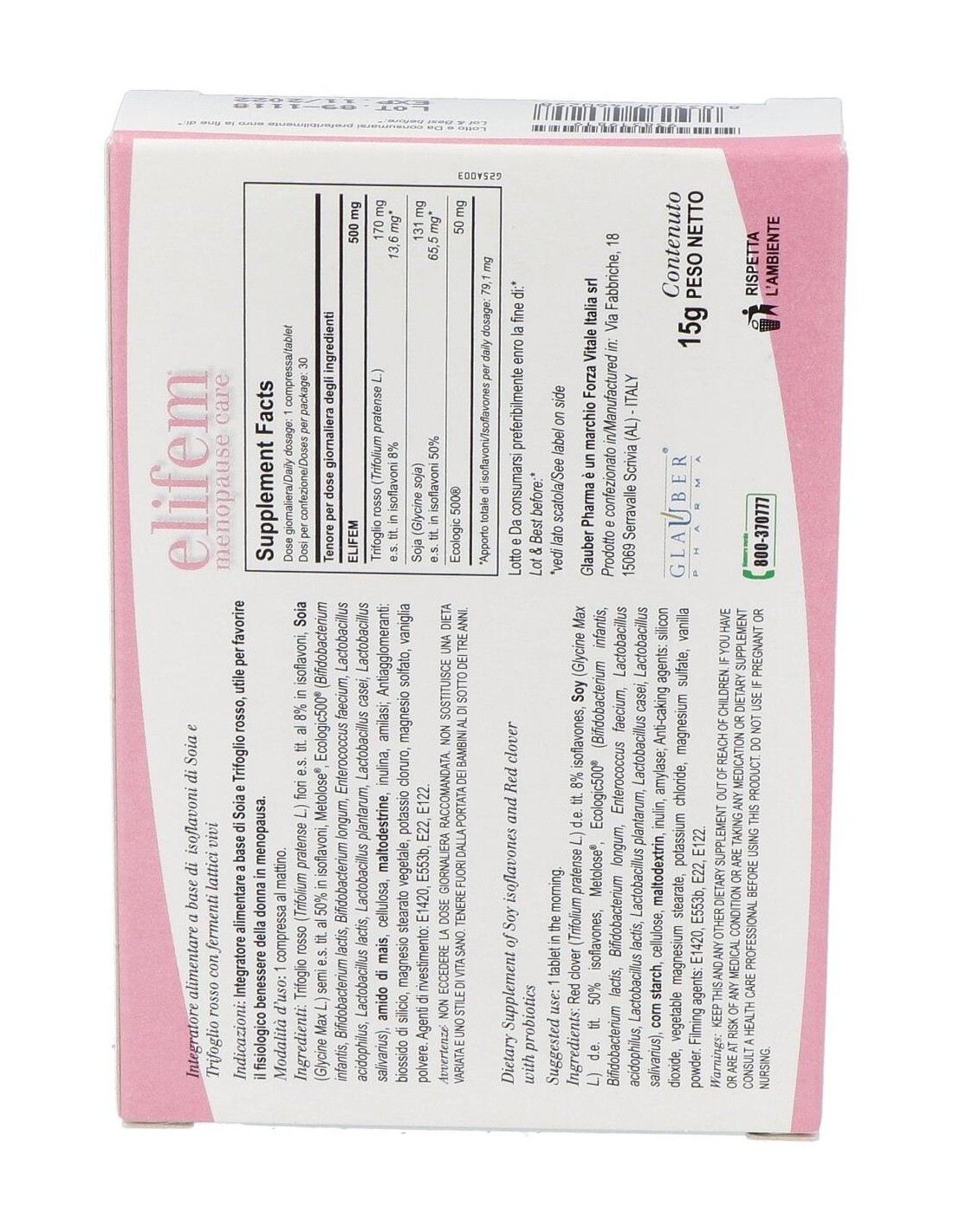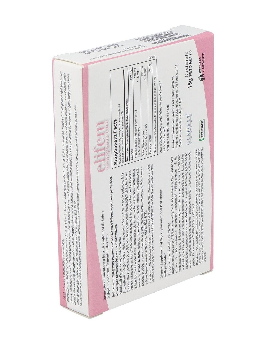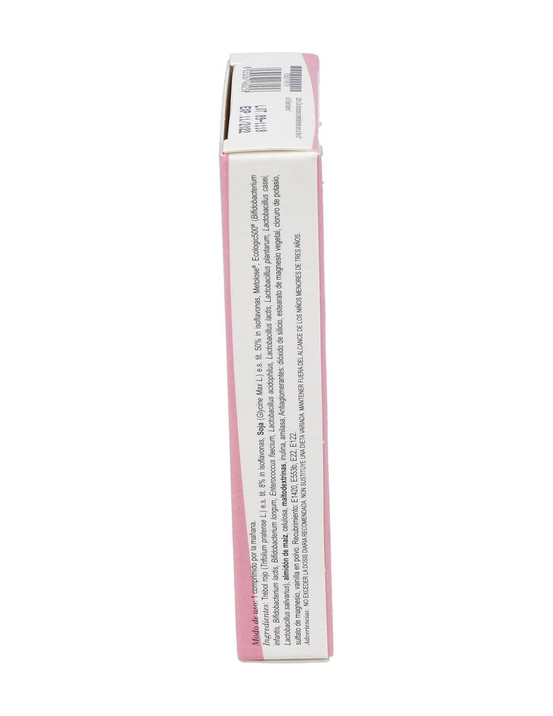 Soja (Glycine soja) e.s. tit. 50% in isoflavonas, Trébol rojo (Trifolium pratense) e.s. tit. 8% in isoflavonas, Metolose®, Ecologic500® (Bifidobacterium infantis, Bifidobacterium lactis, Bifidobacterium longum, Enterococcus faecium, Lactobacillus acidophilus, Lactobacillus lactis, Lactobacillus plantarum, Lactobacillus casei, Lactobacillus salivarius), almidón de maíz, celulosa, maltodextrinas, inulina, amilasa: Antiaglomerantes: dióxido de silicio, estearato de magnesio vegetal, cloruro de potasio, sulfato de magnesio, vainilla en polvo. Recubrimiento: almidón acetilado (E1420), talco, glicerol, colorantes (E122).