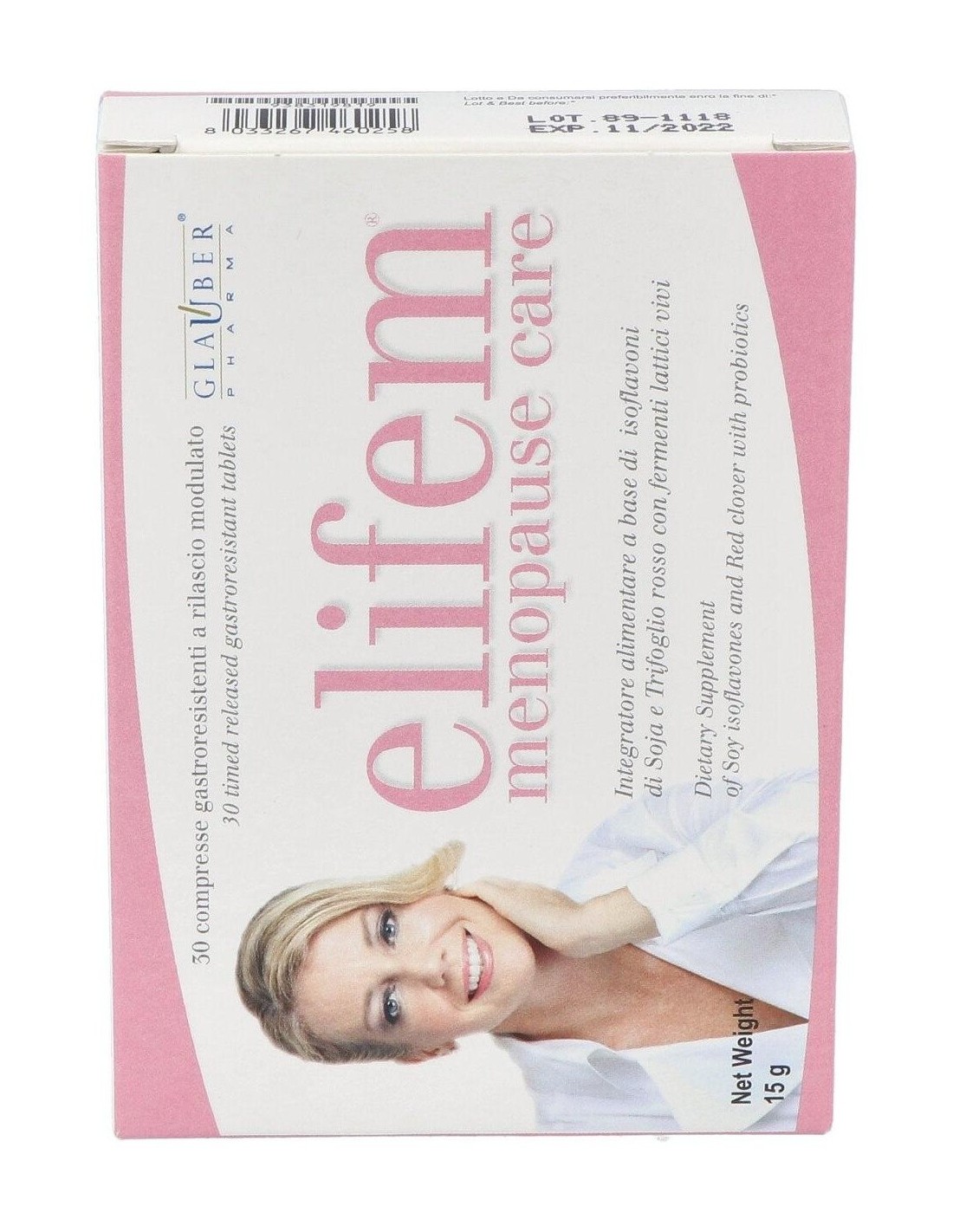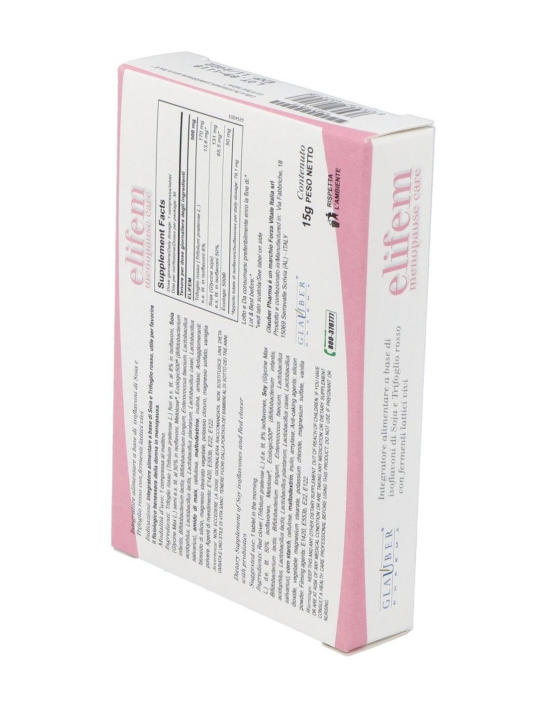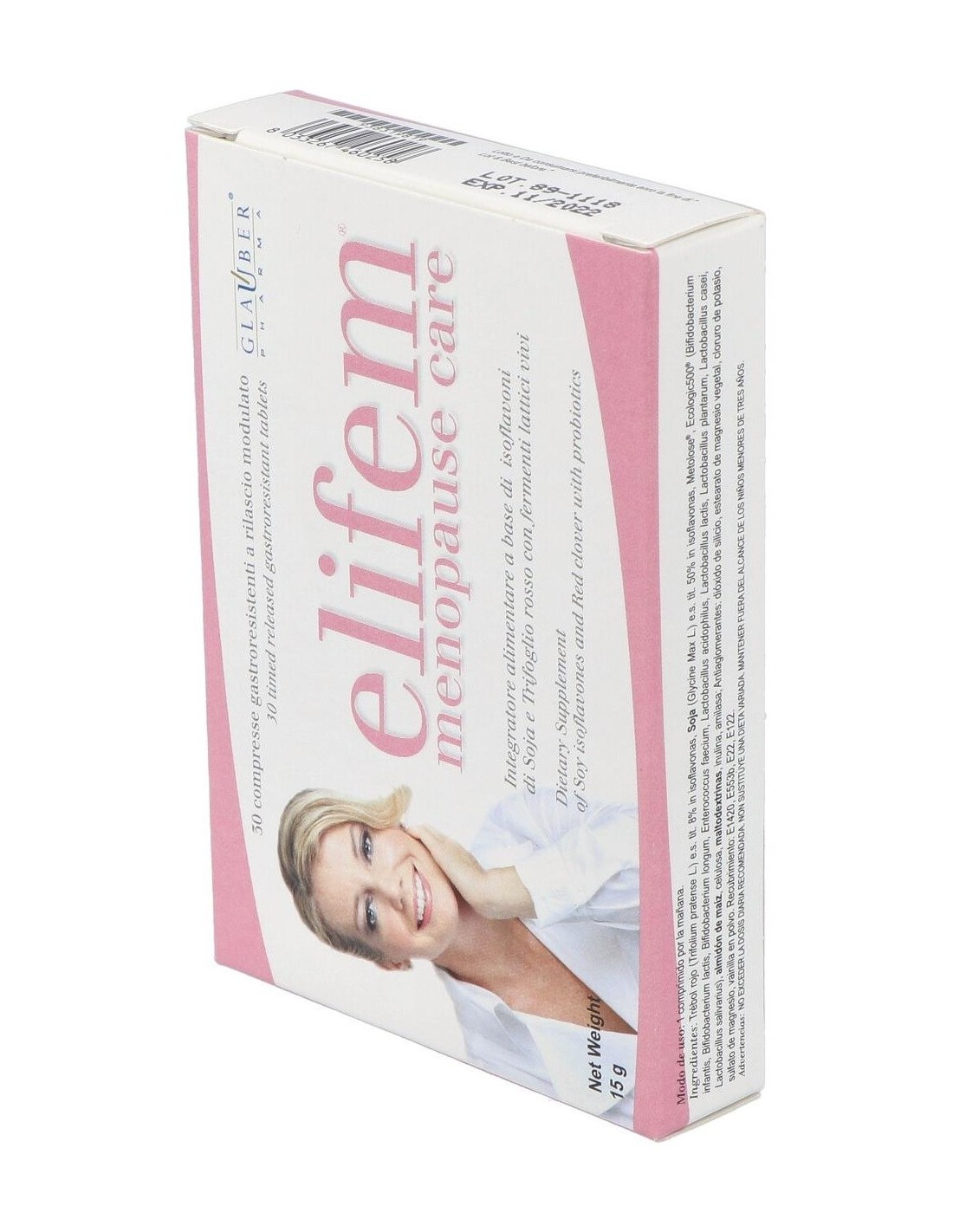 Soja (Glycine soja) e.s. tit. 50% in isoflavonas, Trébol rojo (Trifolium pratense) e.s. tit. 8% in isoflavonas, Metolose®, Ecologic500® (Bifidobacterium infantis, Bifidobacterium lactis, Bifidobacterium longum, Enterococcus faecium, Lactobacillus acidophilus, Lactobacillus lactis, Lactobacillus plantarum, Lactobacillus casei, Lactobacillus salivarius), almidón de maíz, celulosa, maltodextrinas, inulina, amilasa: Antiaglomerantes: dióxido de silicio, estearato de magnesio vegetal, cloruro de potasio, sulfato de magnesio, vainilla en polvo. Recubrimiento: almidón acetilado (E1420), talco, glicerol, colorantes (E122).