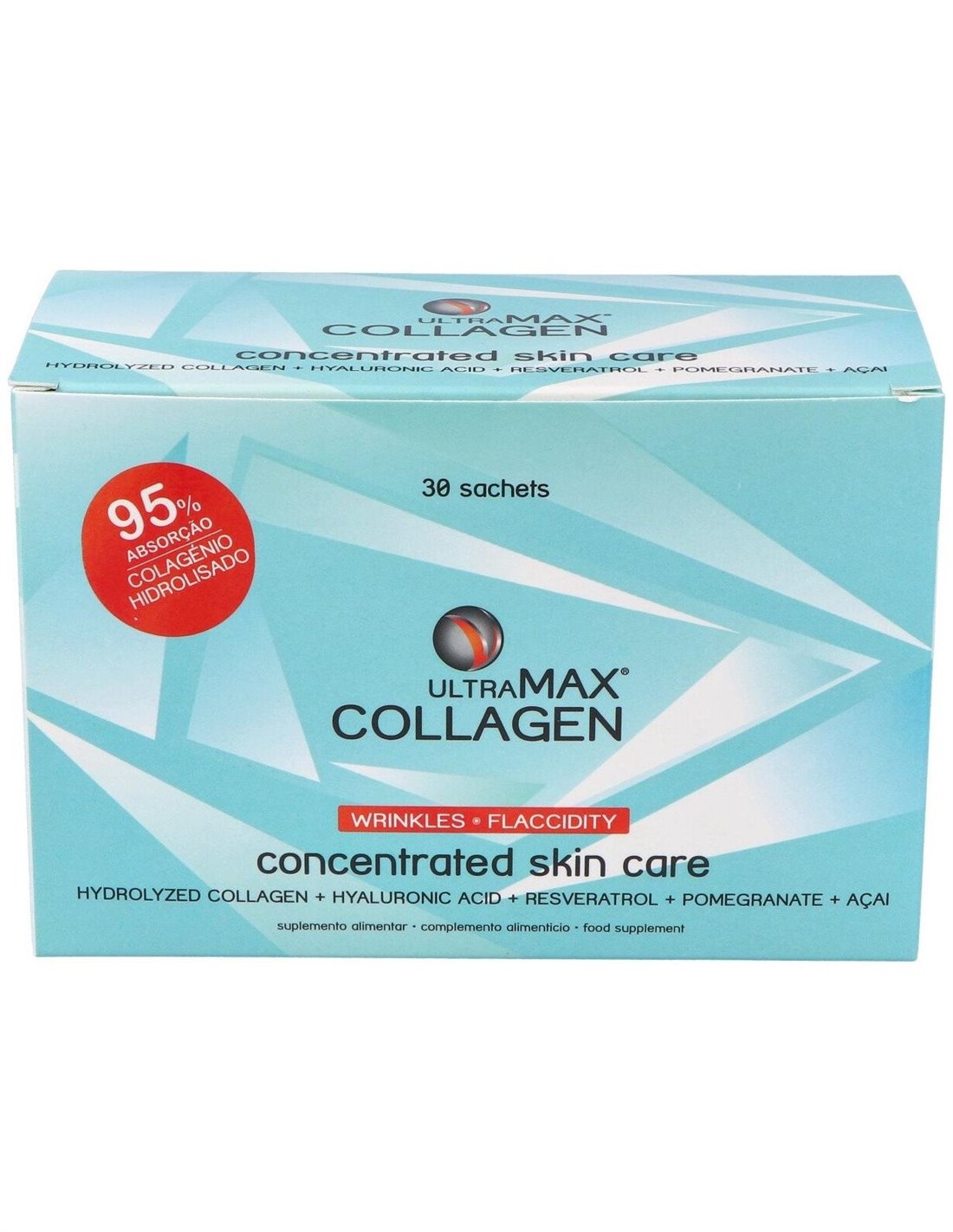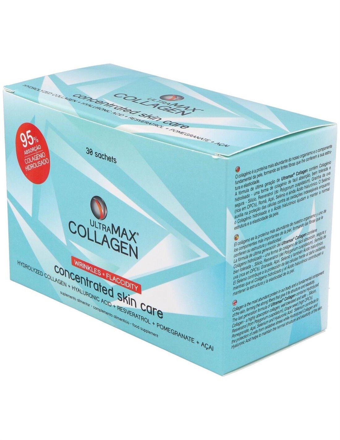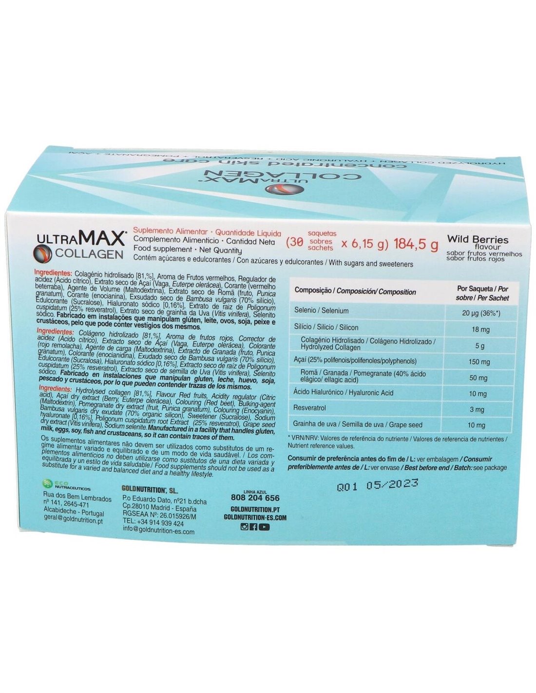 Colágeno hidrolizado (81%), Aroma de frutos rojos, Corrector de acidez (ácido cítrico monohidratado), Extracto seco de açaí (2,43%), Colorante (rojo remolacha), Agente de carga (maltodextrina), Extracto de granada (0,81%), Colorante (enocianidina), Exudado seco de bambu tabashir - 70% silicio orgánico (0,41%), Edulcorante (sucralosa), Hialuronato sódico (0,16%), Extracto seco de raíz de Poligonum cuspidatum - 25% resveratrol (0,16%), Extracto seco de semilla de uva (0,16%), Selenito sódico.