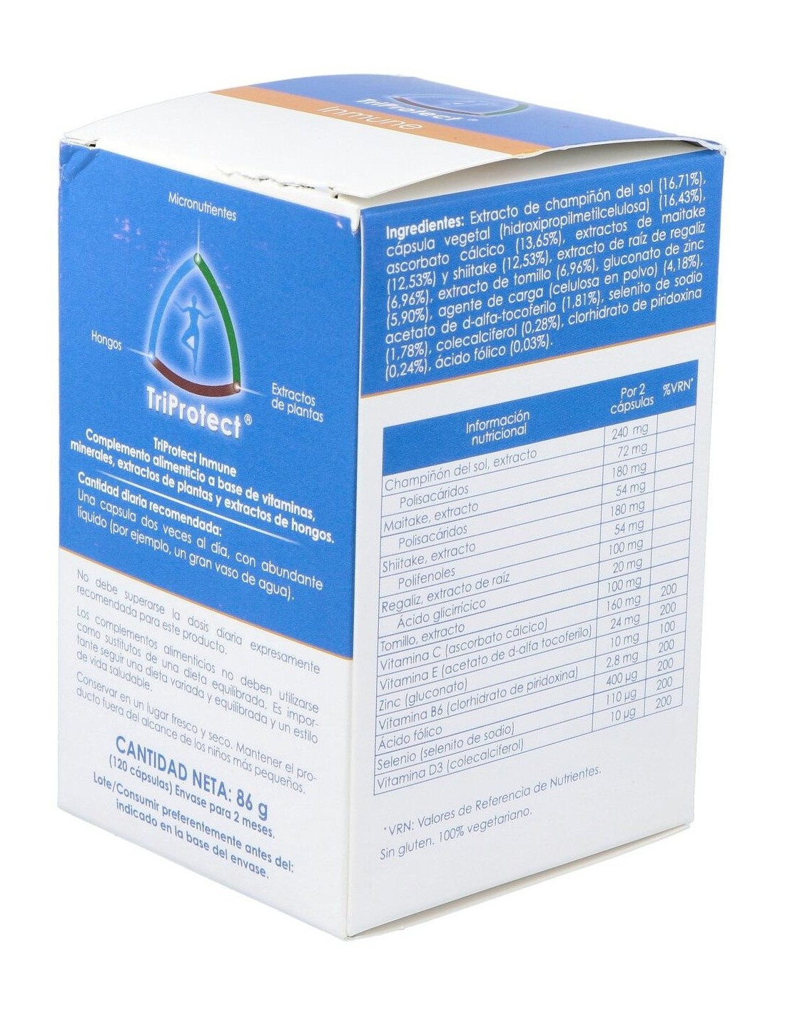 Otros ingredientes:Cápsula vegetal (hidroxipropilmetilcelulosa), agente de carga (celulosa en polvo).Modo de empleo:Tomar 2 cápsulas al día (repartidas por ejemplo una por la mañana y otra por la noche), con abundante líquido.Presentación:Envase de 120 cápsulas vegetales.Recomendaciones y advertencias:Apto para vegetarianos. No contiene gluten ni lactosa.