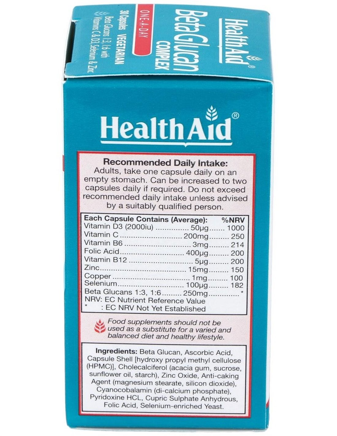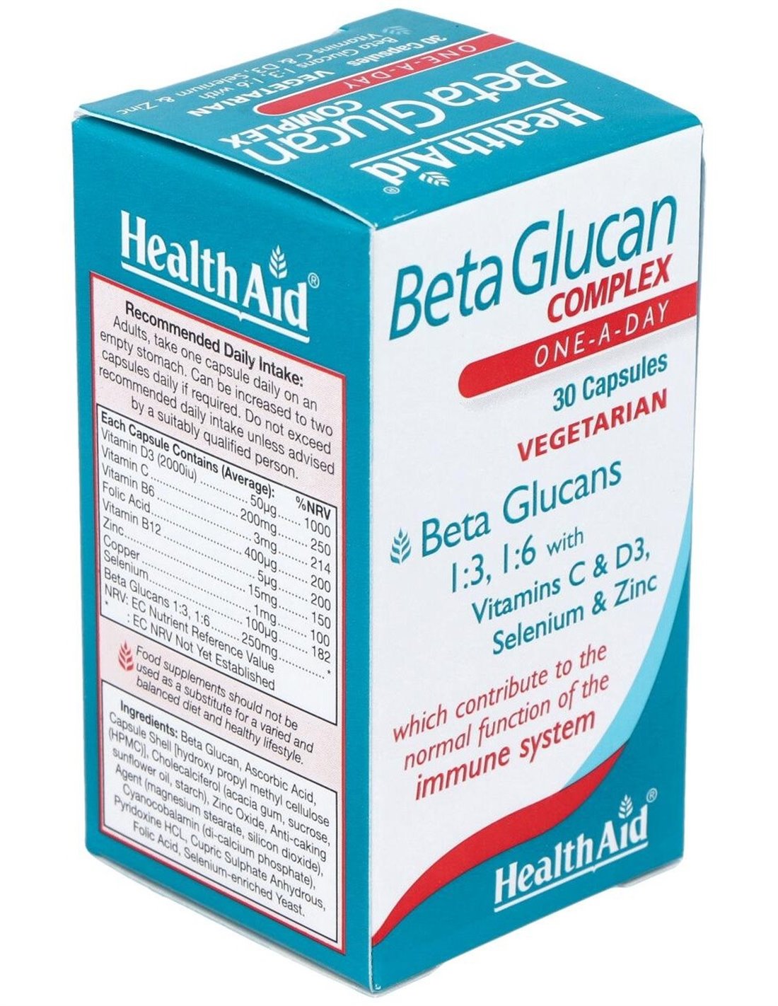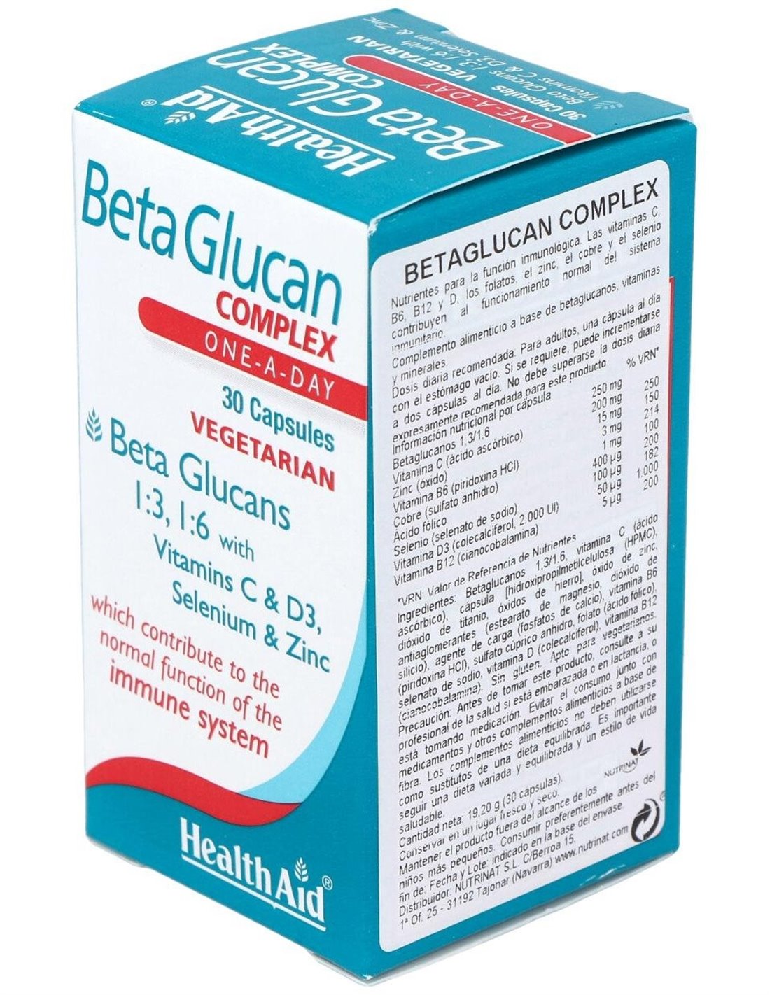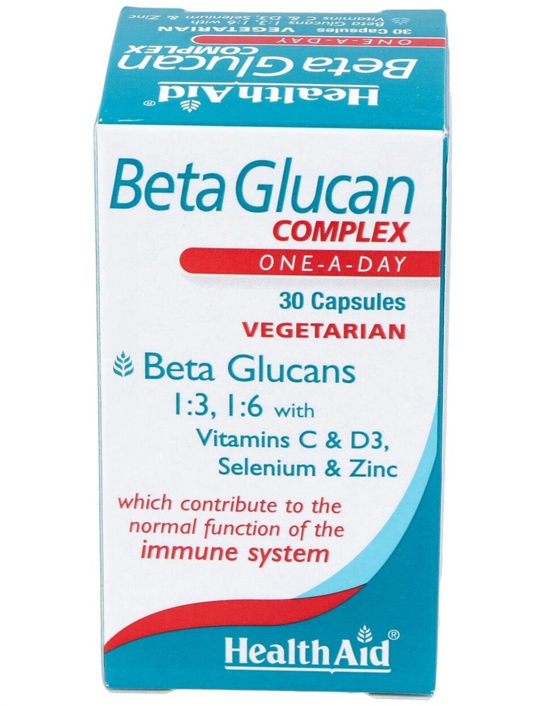 HEALTH AIDEl Beta Glucan Complex 30Vcap. de Health Aid es un suplemento para personas que buscan apoyar su sistema inmunológico, formulado con beta glucanos que contribuyen a la respuesta natural del organismo.