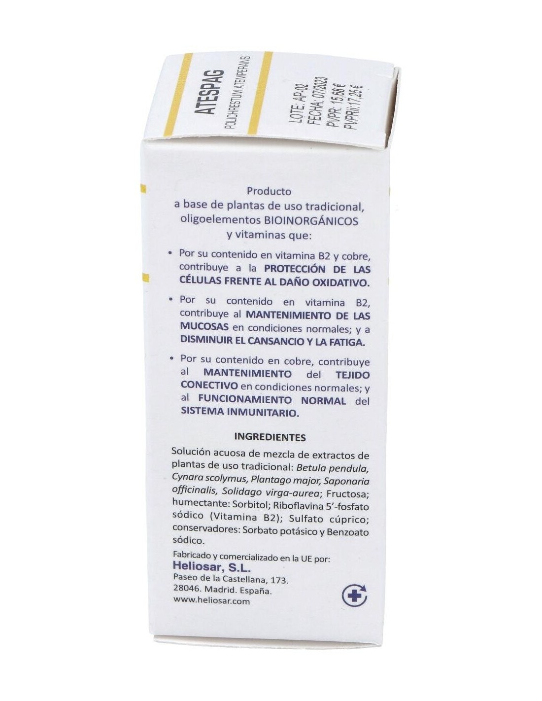 HELIOSARPor su contenido en vitamina B2 y cobre, contribuye a la protección de las células frente al daño oxidativo, al mantenimiento de las mucosas en condiciones normales, a disminuir el cansancio y la fatiga, al mantenimiento del sistema conectivo en condiciones normales y al funcionamiento normal del sistema inmunitario. ATESPAG polichrestum atemperans 50ml.