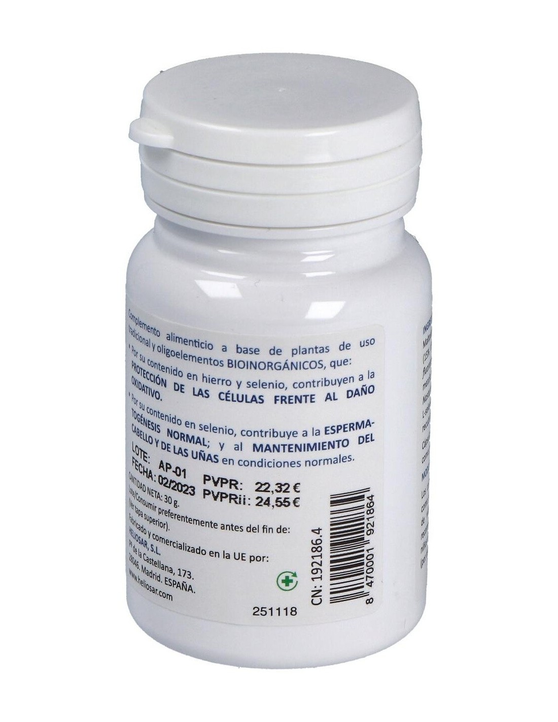 Maltodextrina: Fluoruro de calcio (Calcium fluoratum): Sulfato de calcio (Calcium sulfuricum): mezcla de extractos vegetales de: Galium aparine, Nasturtium officinale, Stellaria media: Fosfato ferroso (Ferrum phosphoricum) (15% VRN de Hierro): Lseleniometionina (15% VRN de Selenio): Agente de recubrimiento: Sales magnésicas de ácidos grasos.