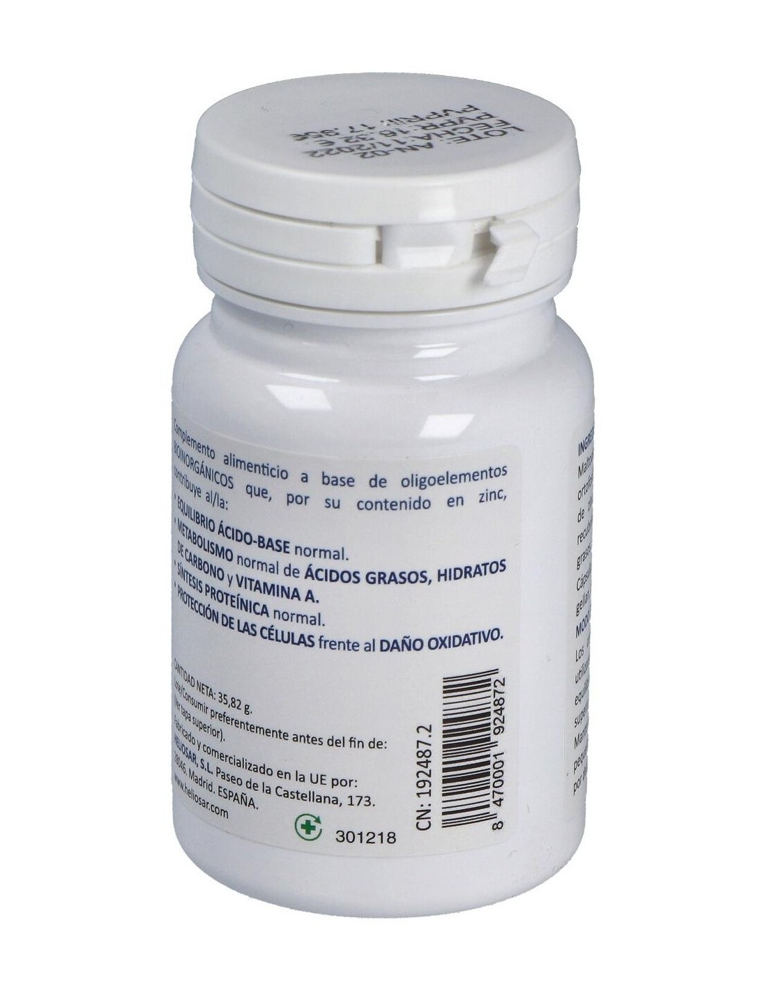 Complemento alimenticio en cápsulas sin gluten ni lactosa, a base de oligoelementos bioinorgánicos que está especialmente ideado para ayudar a mantener un equilibrio del ácido base normal, a fomentar un normal metabolismo de los ácidos grasos, hidratos de carbono y vitamina A, la síntesis proteínica normal y una protección de las células frente al daño oxidativo.
