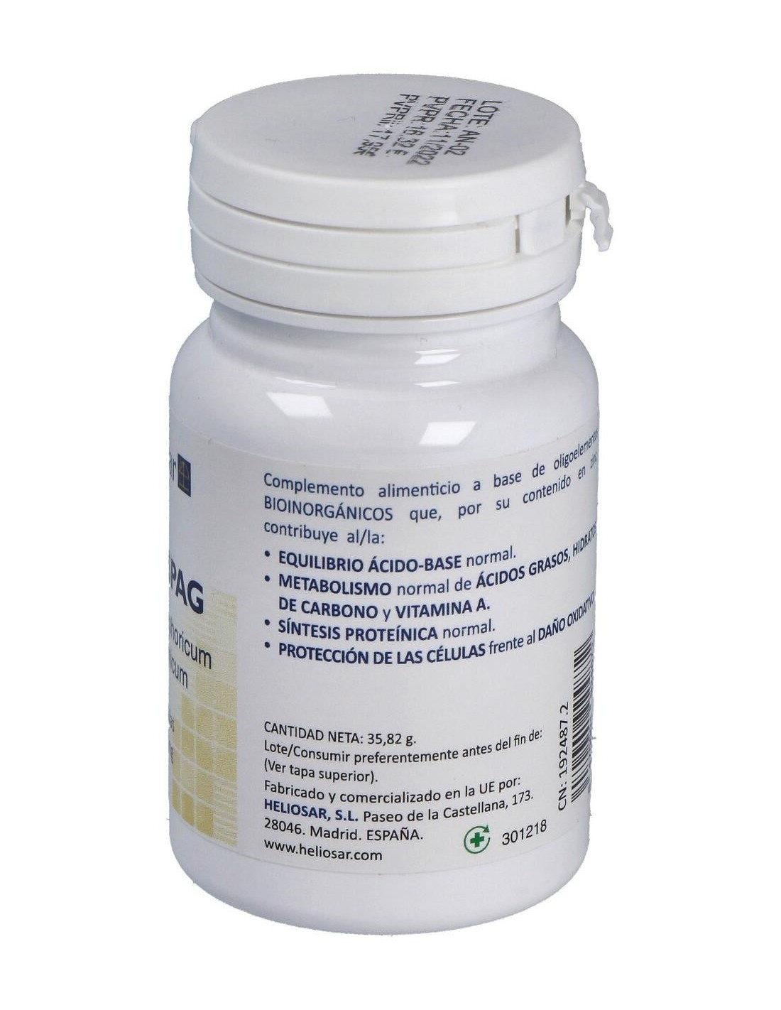 HELIOSARComplemento alimenticio en cápsulas sin gluten ni lactosa, a base de oligoelementos bioinorgánicos que está especialmente ideado para ayudar a mantener un equilibrio del ácido base normal, a fomentar un normal metabolismo de los ácidos grasos, hidratos de carbono y vitamina A, la síntesis proteínica normal y una protección de las células frente al daño oxidativo.Modo de empleoTomar 1 cápsula,2 veces al día.