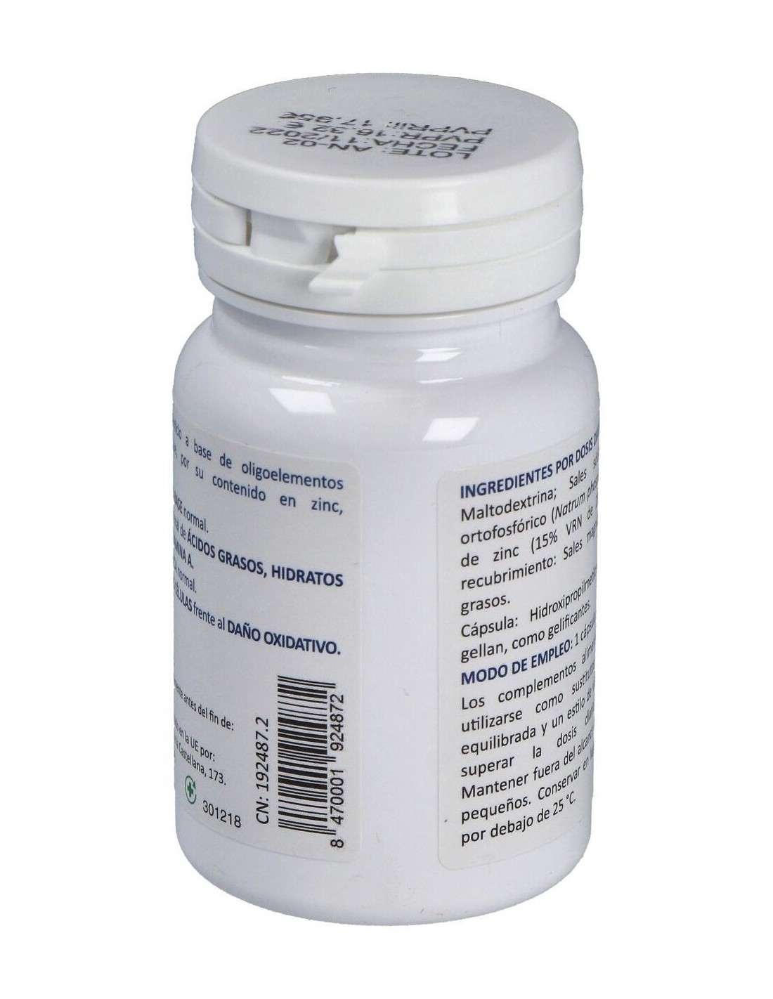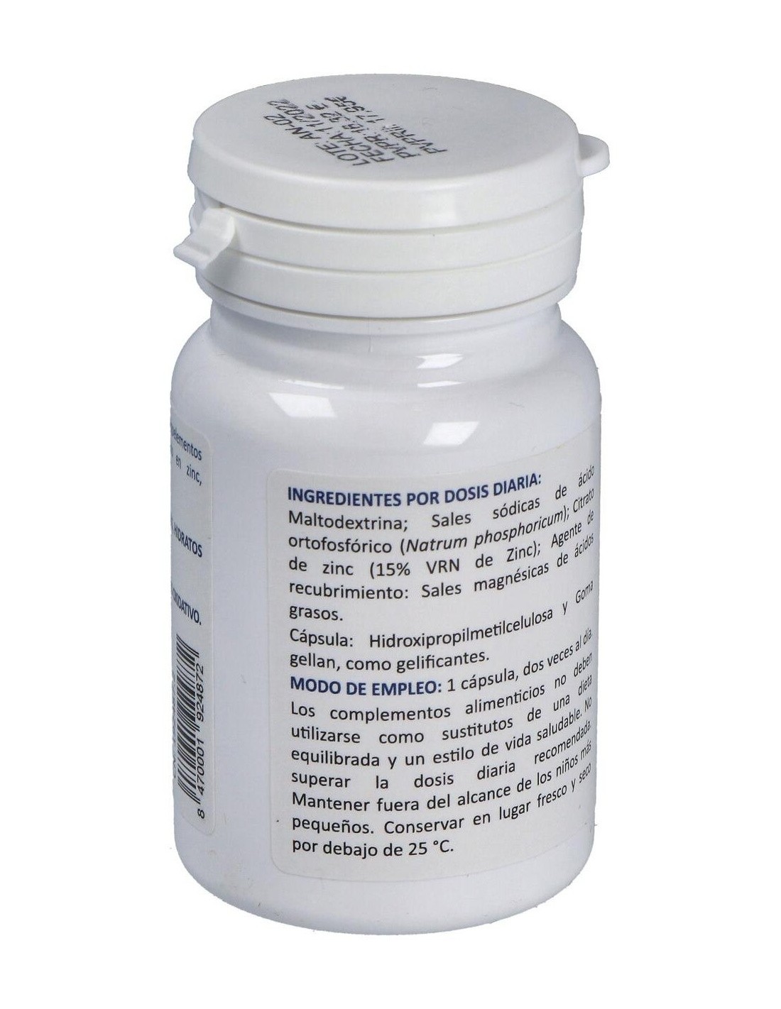Maltodextrina, sales sódicas de ácido ortofosfórico (natrum phosphoricum), citrato de zinc (15% VRN de zinc), agente de recubrimiento (sales magnésicas de ácidos grasos), cápsula (hidroxipropilmetilcelulosa y goma gellan).