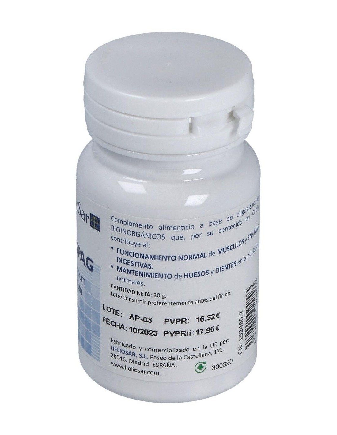 HELIOSARComplemento alimenticio a base de oligoelementos bioinorgánicos que, por su contenido en Calcio contribuyen al funcionamiento normal de músculos y enzimas digestivas. Además, del mantenimiento de huesos y dientes en condiciones normales.
