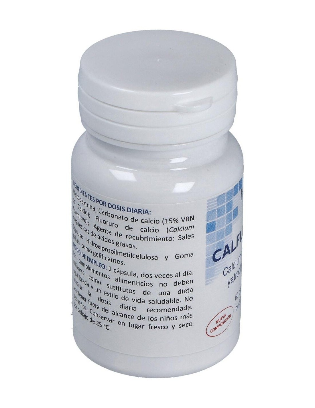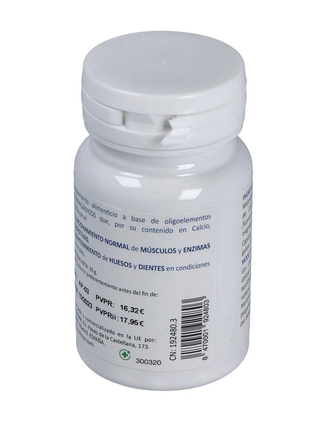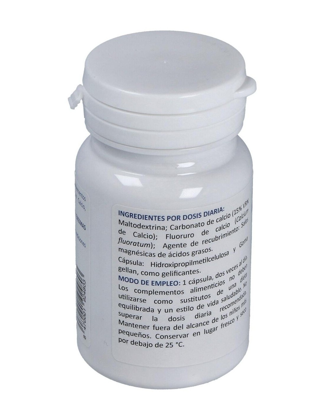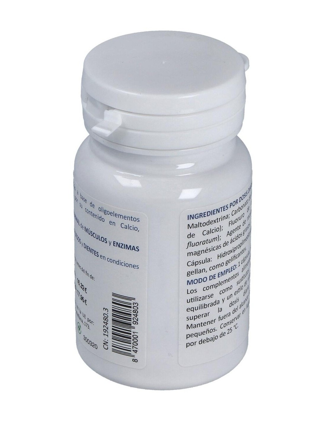Complemento alimenticio a base de oligoelementos bioinorgánicos que, por su contenido en Calcio contribuyen al funcionamiento normal de músculos y enzimas digestivas. Además, del mantenimiento de huesos y dientes en condiciones normales. Producto apto para consumo vegetariano, Kosher y Halal. Contiene: Maltodextrina, Fluoruro de calcio, Sales magnésicas de ácidos grasos (E470b), Hidroxipropimetilcelulosa (E464) y Goma gellan (E418).