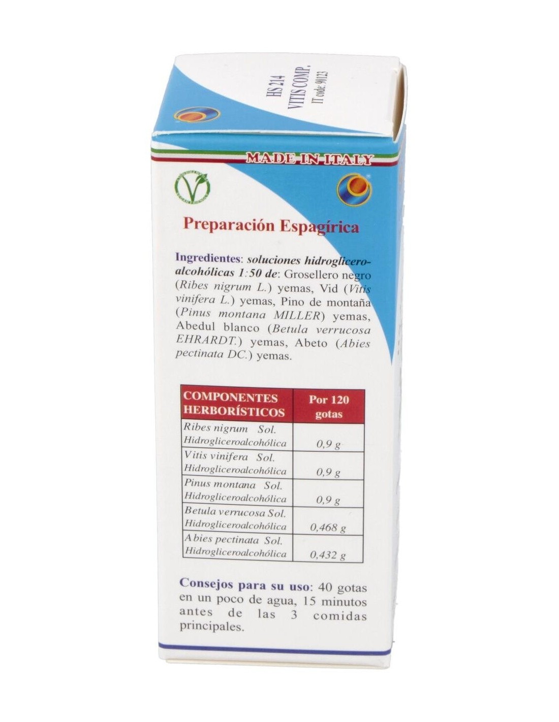 Ingredientes por 120 gotas:MSA (Macerado Espagírico-Alquímico de Solanimus R.E. 1/50) de: Grosellero negro (Ribes nigrum L.) yemas 900 mg, Vid (Vitis vinifera L.) yemas 900 mg, Pino de montaña (Pinus montana Mill.) yemas 900 mg, Abedul blanco (Betula verrucosa Ehrardt) yemas 468 mg, Abeto (Abies pectinata DC.) yemas 432 mg.Modo de empleo:Tomar 30-40 gotas, en poca agua, 3 veces al día.Presentación:Envase de 50 ml.