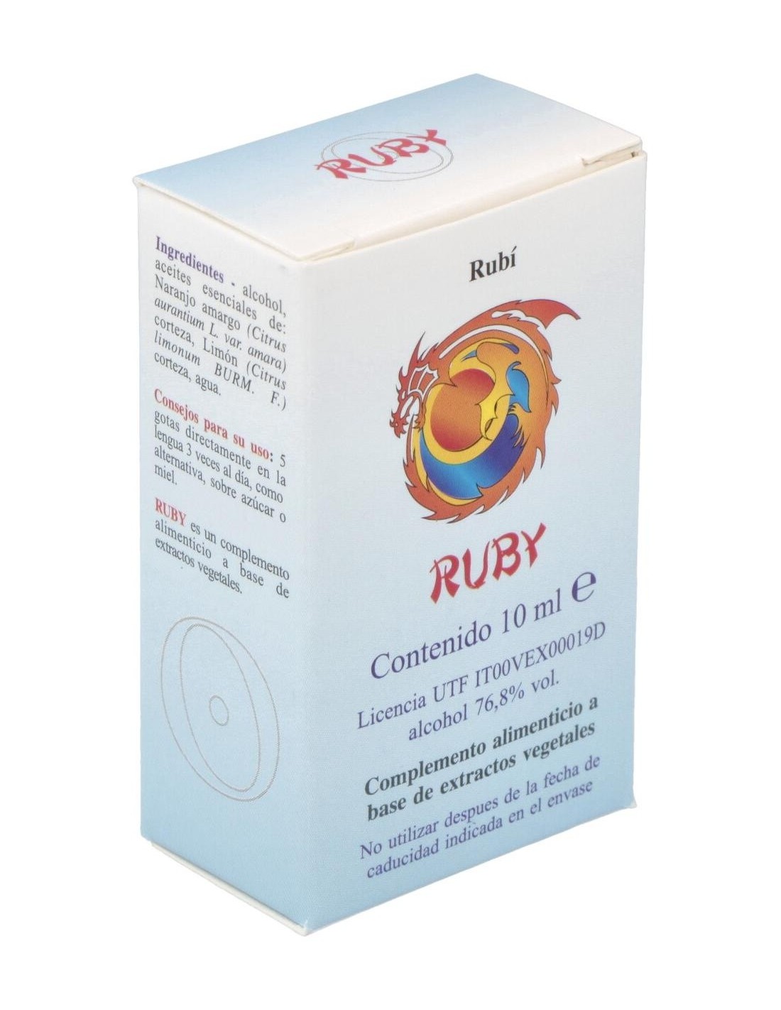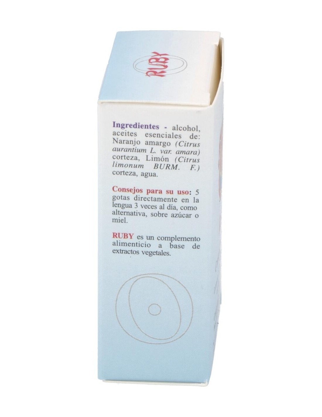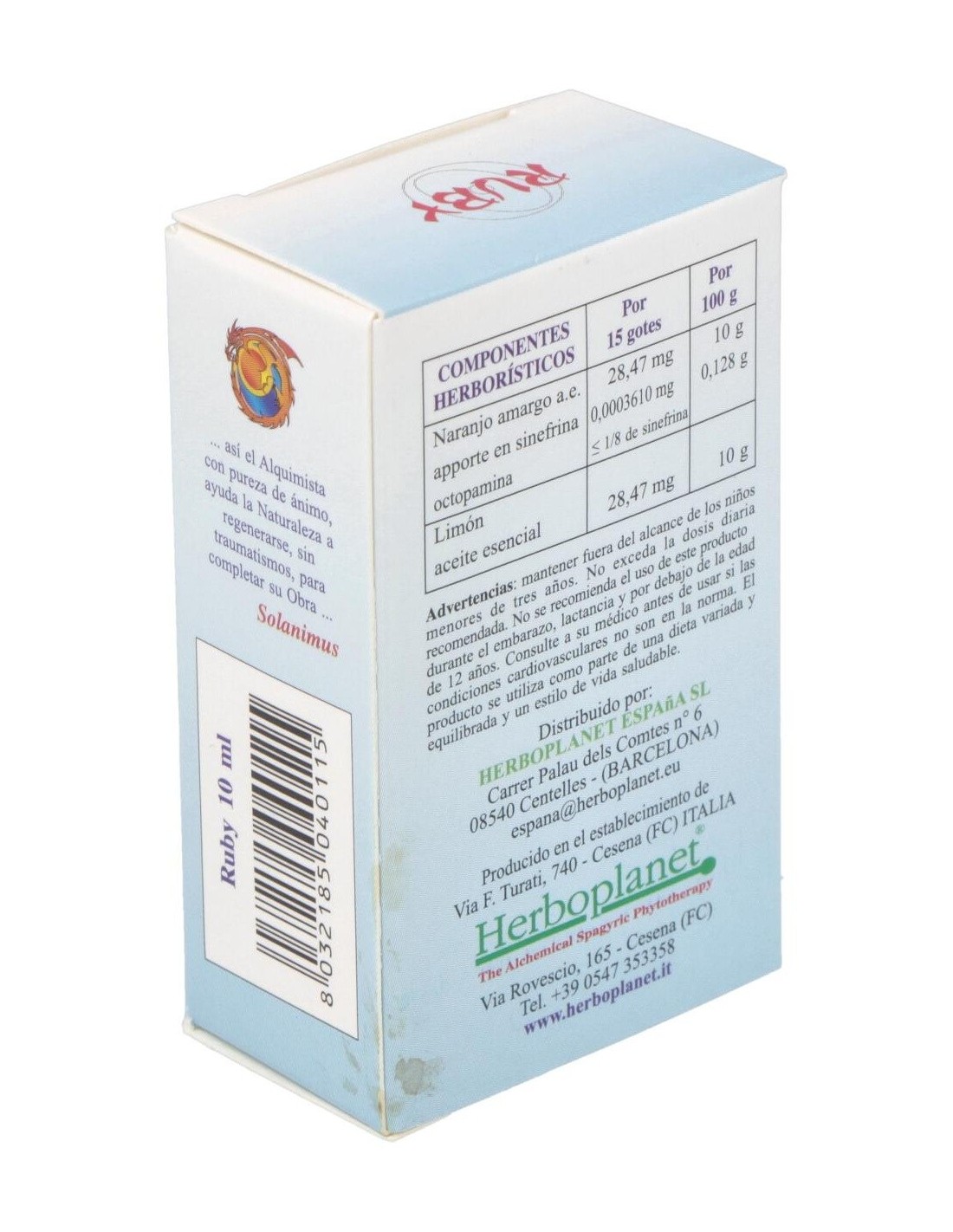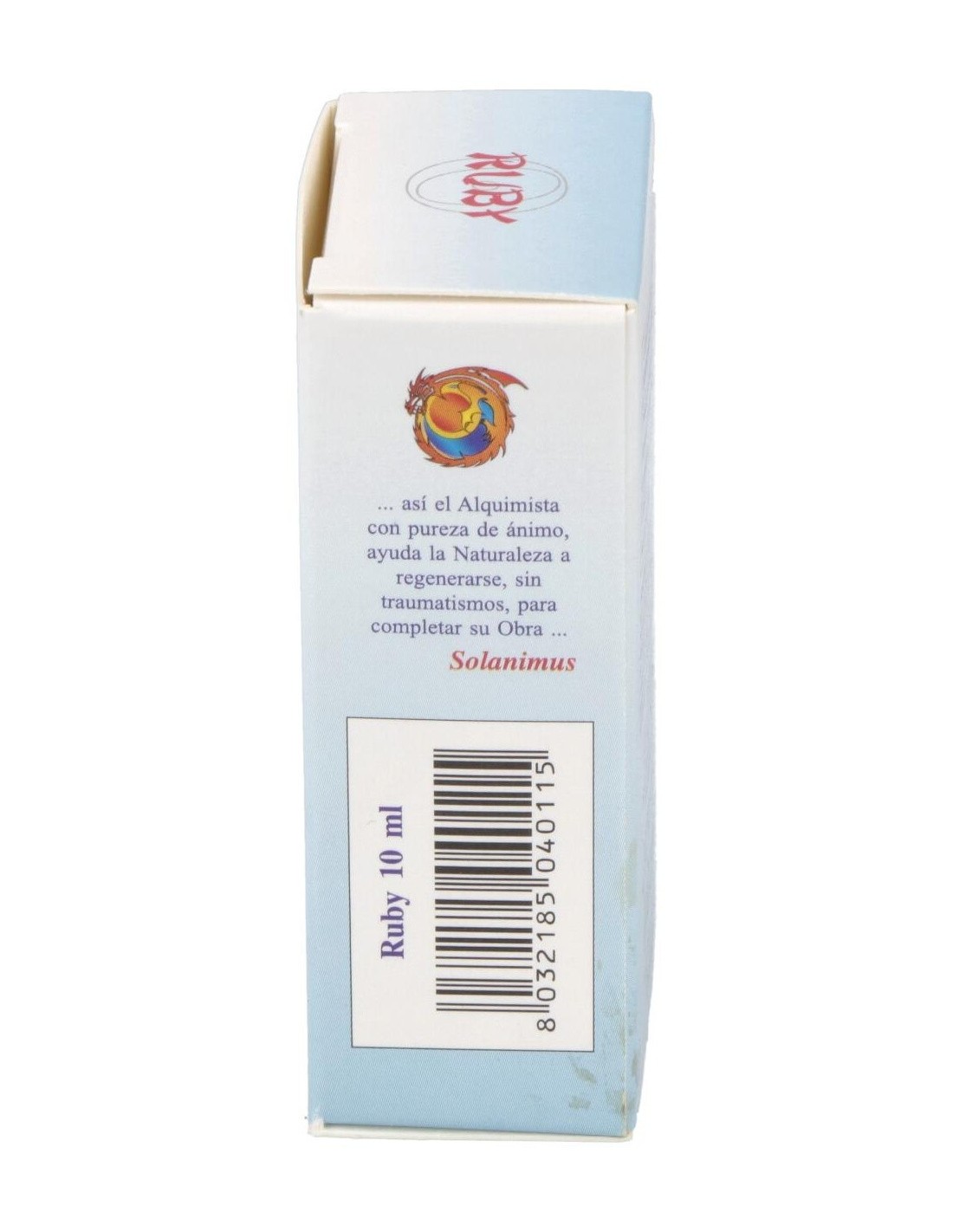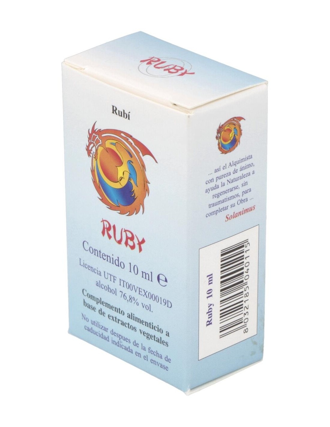 Ruby es un integrador a base de extractos vegetales con Naranjo Amargo contribuye a la relajación y a el bienestar mental. Contribuye a la función digestiva y a la eliminación de los gases. El Limón contribuye a la función digestiva, a la regular motilidad gastrointestinal y eliminación de gases.Siendo el Rubí muy caliente, libera las ondas de calor en forma de rayos cósmicos rojos. En la naturaleza el rayo rojo se sobrepone sobre la humedad y seca las hojas de los árboles impulsando la quema de hojas y maderas muertas. El color cósmico rojo está relacionado con el Sol que representa el ánima del cuerpo humano.PSIQUE: refuerza la capacidad de concentrarse en las tareas personales. Aumenta la vigilia, torna eficiente, impulsivo y espontáneo. Genera actividad y dinamismo, ayudando a salir de la apatía y la pasividad. Capaz de reequilibrar también estados de hiperactividad, sin embargo, estimula la actividad sexual.Ingredientes por 10 ml:QSA (Quintaesencia Espagírica Alquímica de Solanimus) de Naranjo amargo (Citrus aurantium L. var. amara) 4,9 ml (aporte de sinefrina 0,0003610 mg, octopamina ± 1/8 de sinefrina), QSA (Quintaesencia Espagírica Alquímica de Solanimus) de Limón (Citrus limonum Burm. F.) 4,9 ml. Oro alquímico 0,1 ml. Rubí alquímico 0,1 ml.Alcohol 80% vol.Modo de empleo:Tomar 5 gotas directamente en la lengua 3 veces al día, como alternativa, sobre azúcar o miel.Presentación:Envase de 10 ml.