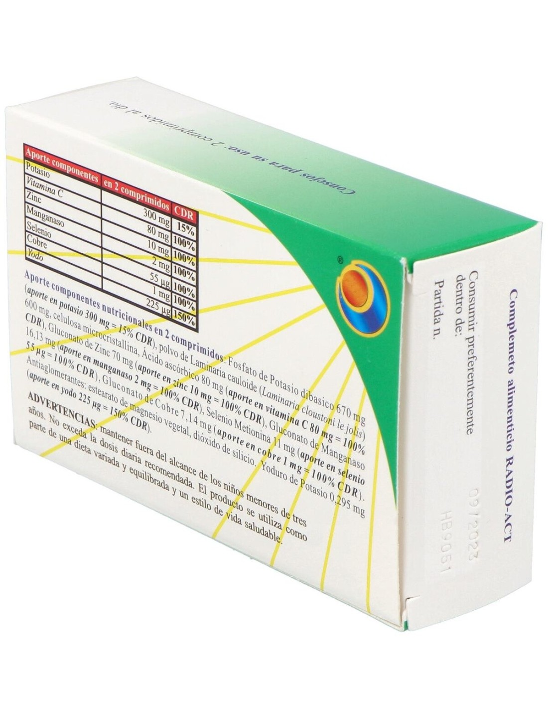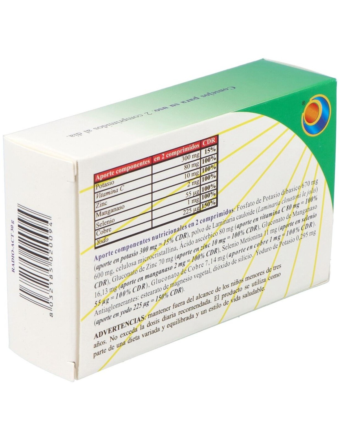 Radio-Act de Herboplanet es un complemento alimenticio a base de yodo que contribuye a la producción normal de hormonas de tiroides y a la normal función cuyas, potasio que contribuye al funcionamiento normal del sistema nervioso, vitamina C y el selenio que contribuyen a la protección de las células el estrés oxidante, Zinc que contribuye a la normal síntesis del ADN, Cobre que contribuye al mantenimiento de tejidos conjuntivos unidos normales y Laminaria que contribuye al estímulo del metabolismo.Principios activos: