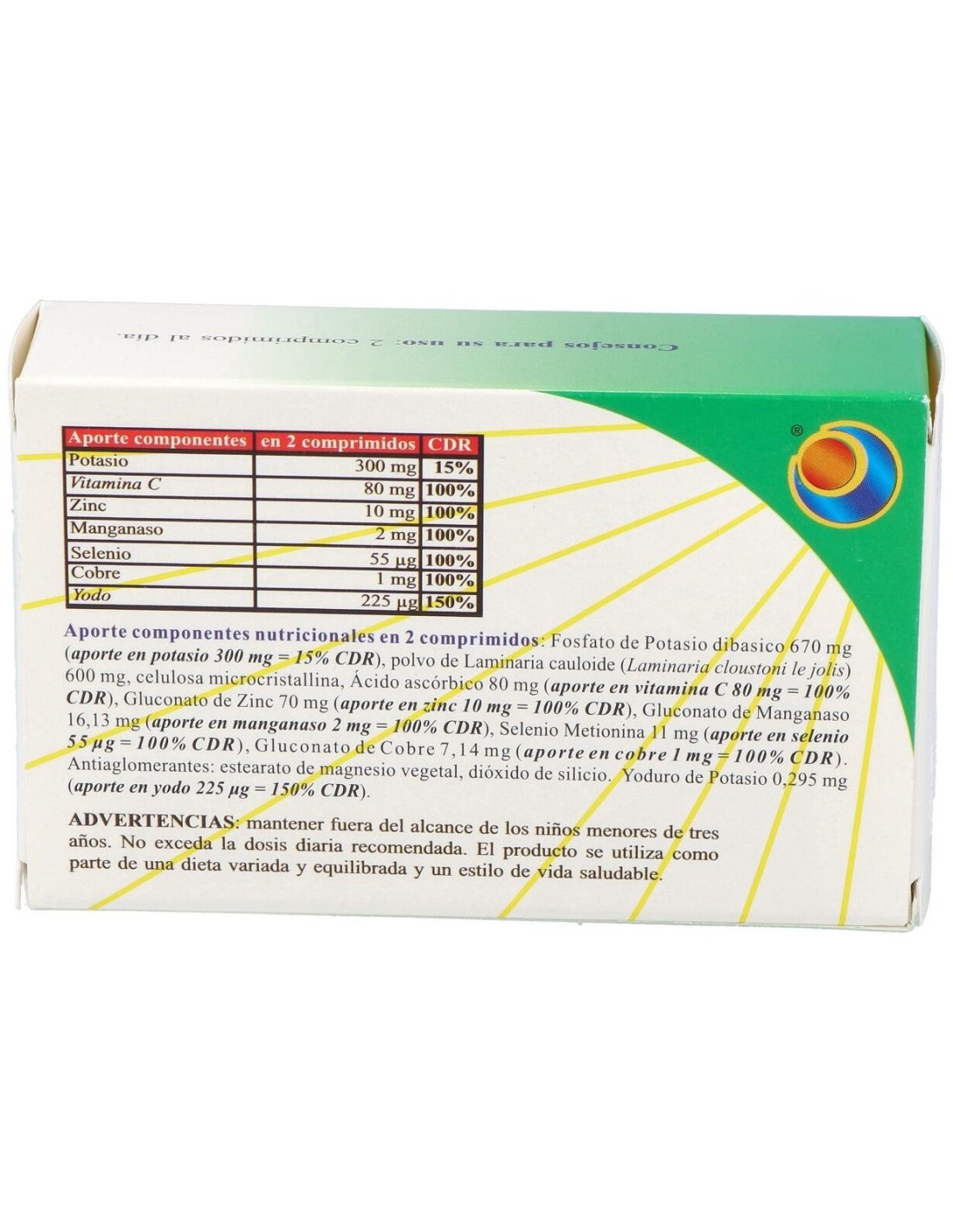 Ingredientes 2 comprimidos:Fosfato de Potasio dibasico 670 mg (aporte en potasio 300 mg = 15% CDR), polvo de Laminaria cauloide (Laminaria cloustoni le jolis) 600 mg, celulosa microcristallina, Ácido ascórbico 80 mg (aporte en vitamina C 80 m. = 100% RDA), Gluconato de Zinc 70 mg (aporte en zinc 10 mg = 100% CDR), Gluconato de Manganaso 16,13 mg (aporte en manganeso 2 mg = 100% CDR), L-seleniometionina 11 mg (aporte en selenio 55 µg = 100% CDR), Gluconato de Cobre 7,14 mg (aporte en cobre 1 mg = 100% CDR). Antiaglomerantes: estearato de magnesio vegetal, dióxido de silicio. Yoduro de Potasio 0,196 mg (aporte en yodo 150 µg = 100% CDR).Modo de empleo:Tomar 1-2 comprimidos al día.Presentación:Envase de 30 comprimidos.