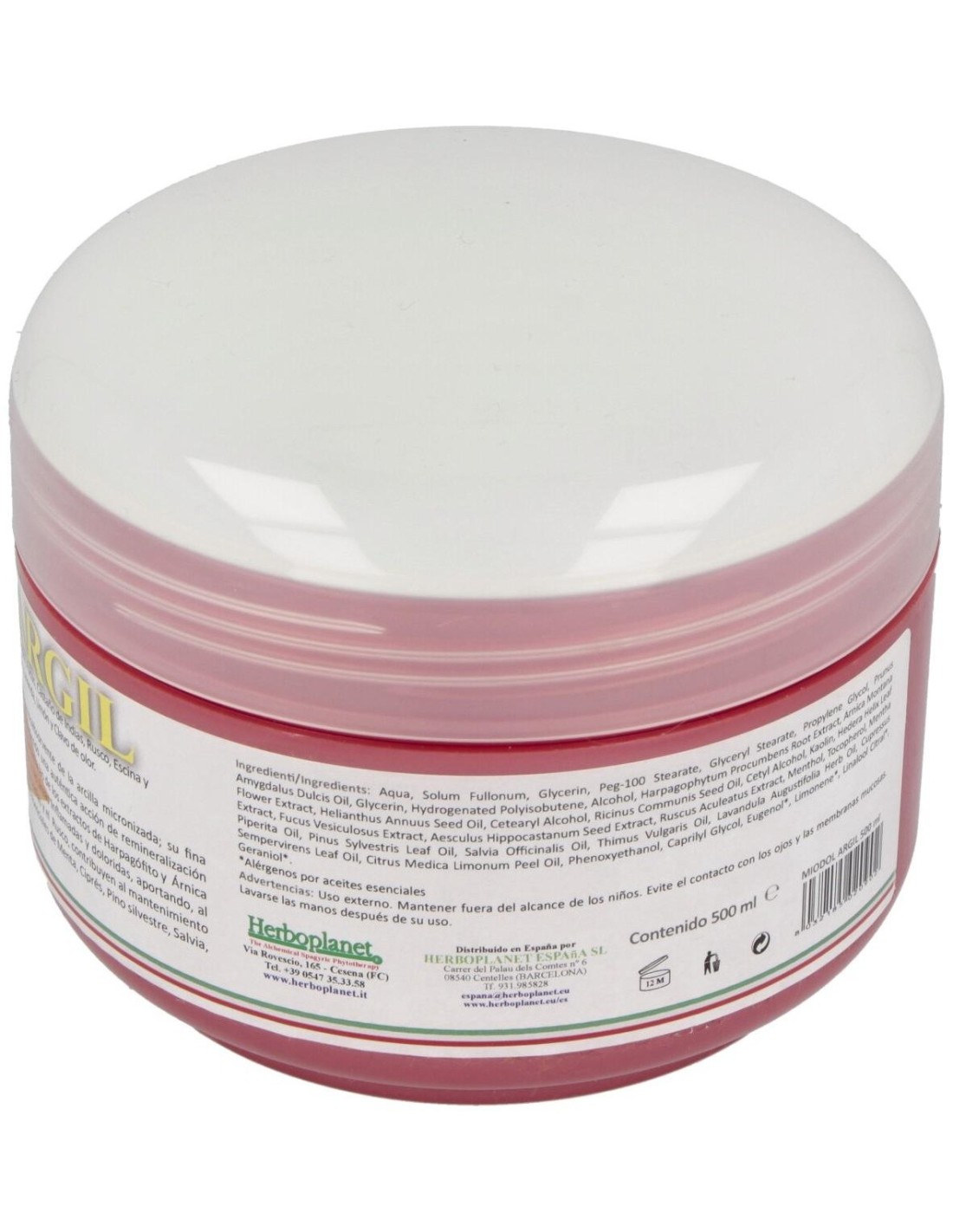 Miodol Argil de Herboplanet es una crema-arcilla para el cuerpo que aprovecha de la capacidad termoabsorvente de la arcilla micronizada; su fina granulometría facilita la liberación y asimilación de los minerales que la componen, produciendo una auténtica acción de remineralización haciéndola útil en zonas sometidas a un estrés mecánico constante.Estas propiedades se suman a las de los extractos de Harpagófito y Árnica que contribuyen a dar una sensación de bienestar a las áreas inflamadas y doloridas, aportando, al mismo tiempo, una acción nutritiva y emoliente. La Hiedra, el Fucus, el Castaño de Indias y el Rusco, contribuyen al mantenimiento de una correcta microcirculación. Se conocen las propiedades antibacterianas de los aceites esenciales de Menta, Ciprés, Pino silvestre, Salvia, Tomillo, Lavanda y Limón que ayudan a refrescar y tonificar la piel.Esta recomendada en casos de esguinces, Hematomas, Subluxaciones, Traumas en general, Inflamación músculo-tendón, Contracturas, Distensiones musculares, Reducción del ácido láctico, Cervicalgia, Fatiga post-deportivo.Ingredientes (INCI):Aqua, Solum Fullonum, Glycerin Peg-100 Stearate, Glyceryl Stearate, Propylene Glycol, Prunus Amygdalus Dulcis Oil, Glycerin, Hydrogenated Polyisobutene, Alcohol, Harpagophytum procumbens Root Extract, Arnica montana Flower Extract, Hilantus Annuus Seed Oil, Cetearyl Alcohol, Ricinus Communis seed Oil, Cetyl Alcohol, Kaolin, Hedera helix Leaf Extract, Fucus vesiculosus Extract, Aesculus hippocastanum Seed Extract, Ruscus aculeatus Extract, Menthol, Tocopherol, Mentha piperita Oil, Pinus sylvestris Leaf Oil, Salvia officinalis Oil, Thymus vulgaris Oil, Lavandula angustifolia Herb Oil, Cupressus sempervirens Leaf Oil, Citrus Medica limonum Peel Oil, Phenoxyethanol, Capryl Glycol, Eugenol*, Limonene*, Linalool*, Citral*, Geraniol*. (*) Alérgenos de los aceites esenciales.Modo de empleo:Aplicar una capa de producto de 2-3 mm sobre el área a tratar y cubrir con una película transparente. Dejar que actúe durante al menos 4 horas. Para optimizar la acción del producto, recomendamos aplicarlo antes de acostarse y dejarlo que actúe toda la noche. Por la mañana, lavar la parte afectada con agua templada.Presentación:Envase de 500 ml.