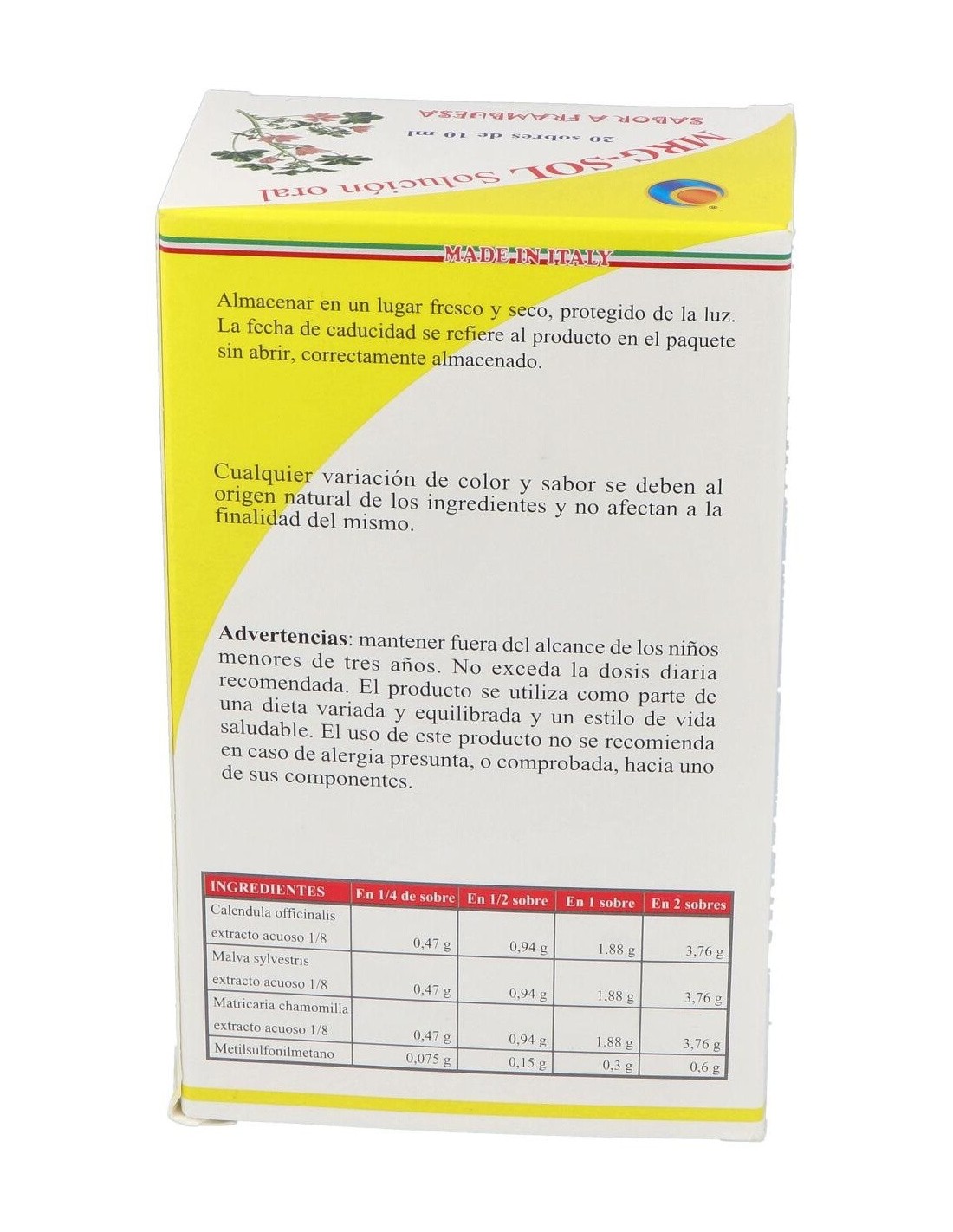 Ingredientes:Glicerol vegetal. Extractos acuosos 1/8 de: Caléndula (Calendula officinalis L.) flores 3,76 g, Malva (Malva sylvestris L.) hojas, Manzanilla (Matricaria chamomilla L.) flores 3,76 g. Metil Sulfonil Metano 0,6 g, Alginato de sodio. Fructosa. Aroma de frambuesa. Conservantes: Sorbato de potasio, Benzoato de sodio.Modo de empleo:Se aconseja tomar el producto puro tal cual según sea necesario o después del almuerzo y antes de acostarse.