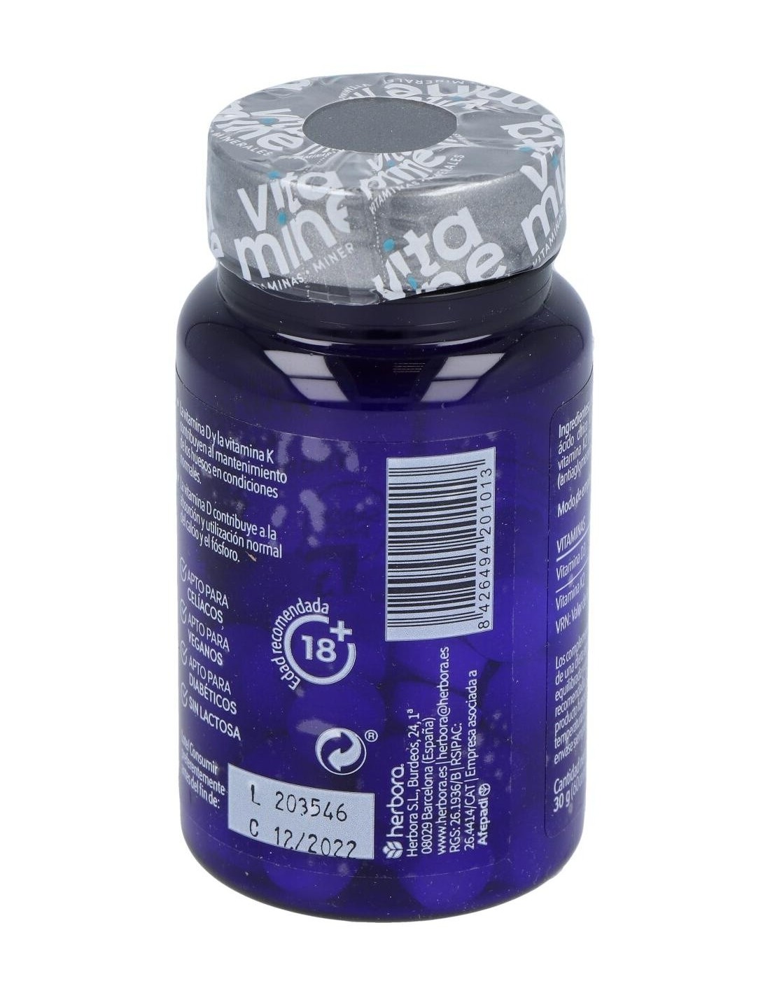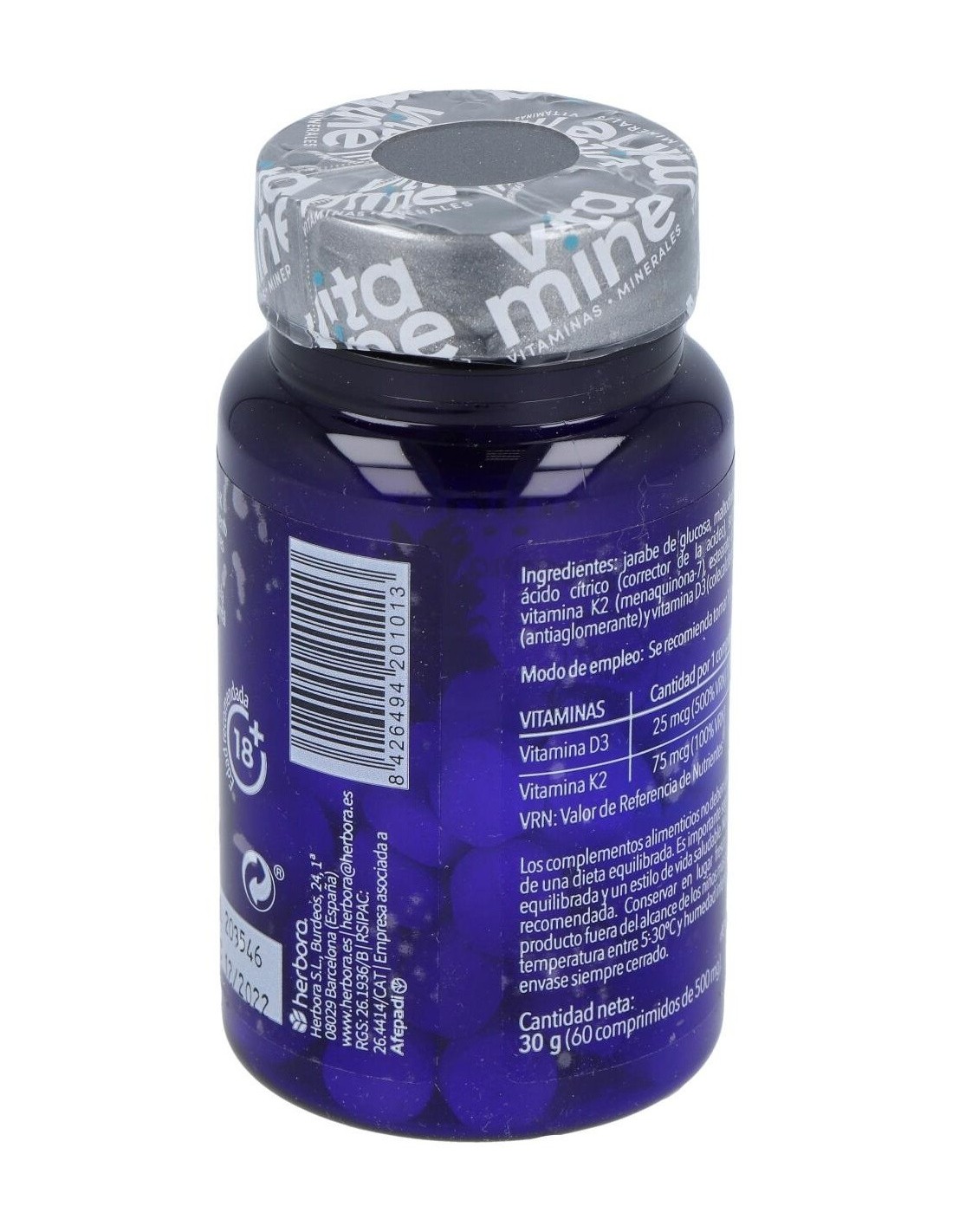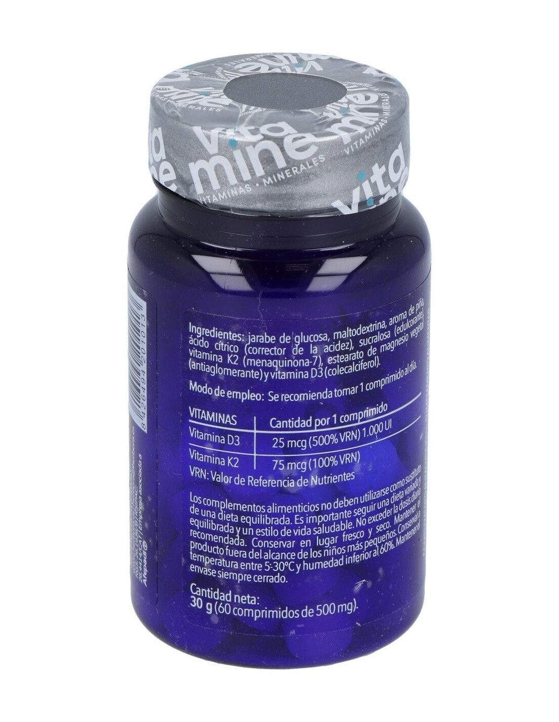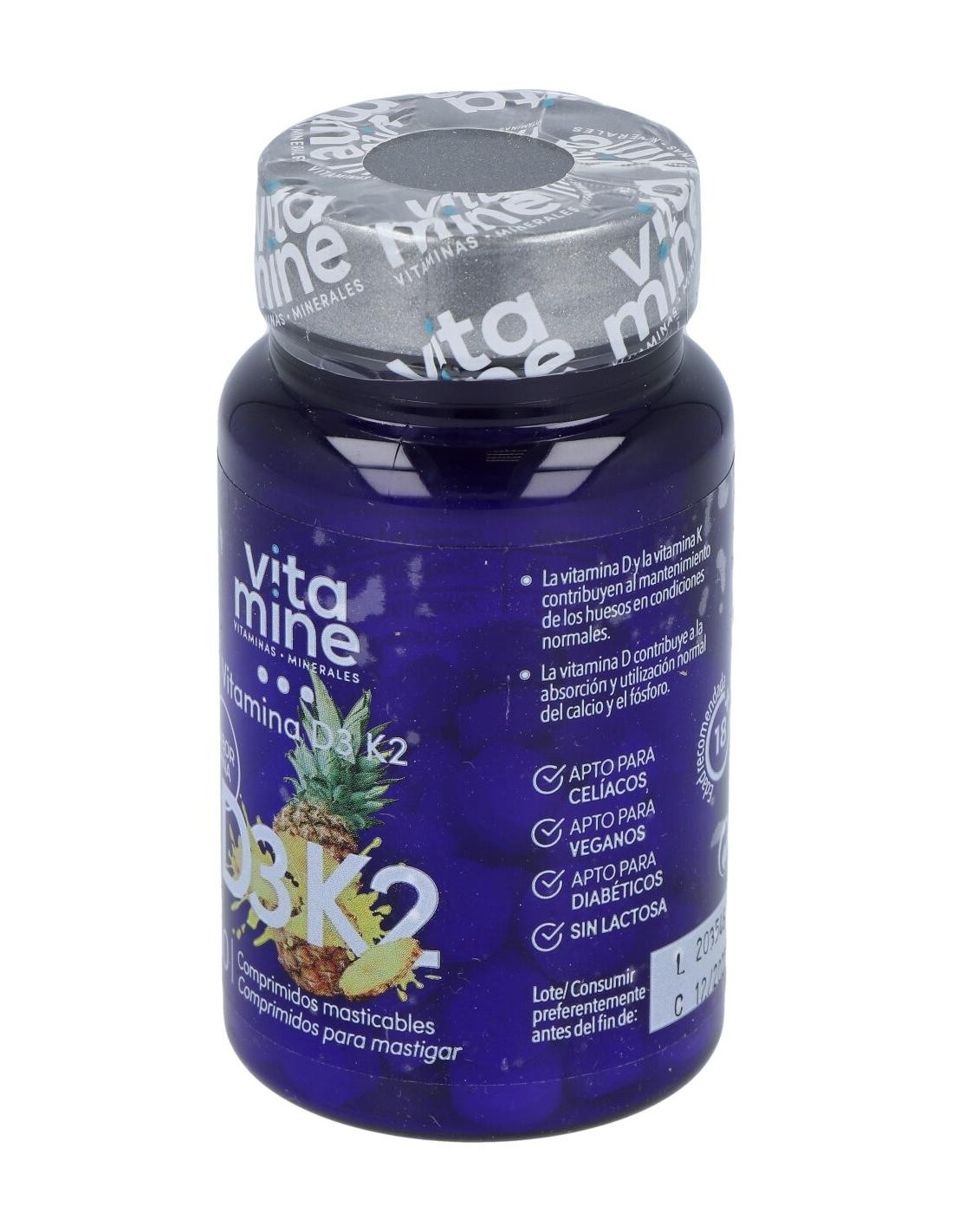 Complemento alimenticio con sabor a piña que ayuda a mantener la salud y el fortalecimiento de los huesos. Formado con Vitamina D3 y K2.Indicadas para la coagulación, puede evitar la calcificación arterial aumentando la seguridad de los suplementos de vitamina D3. De ahí la vinculación de las 2 vitaminas. Formato de 60 cápsulas masticables.