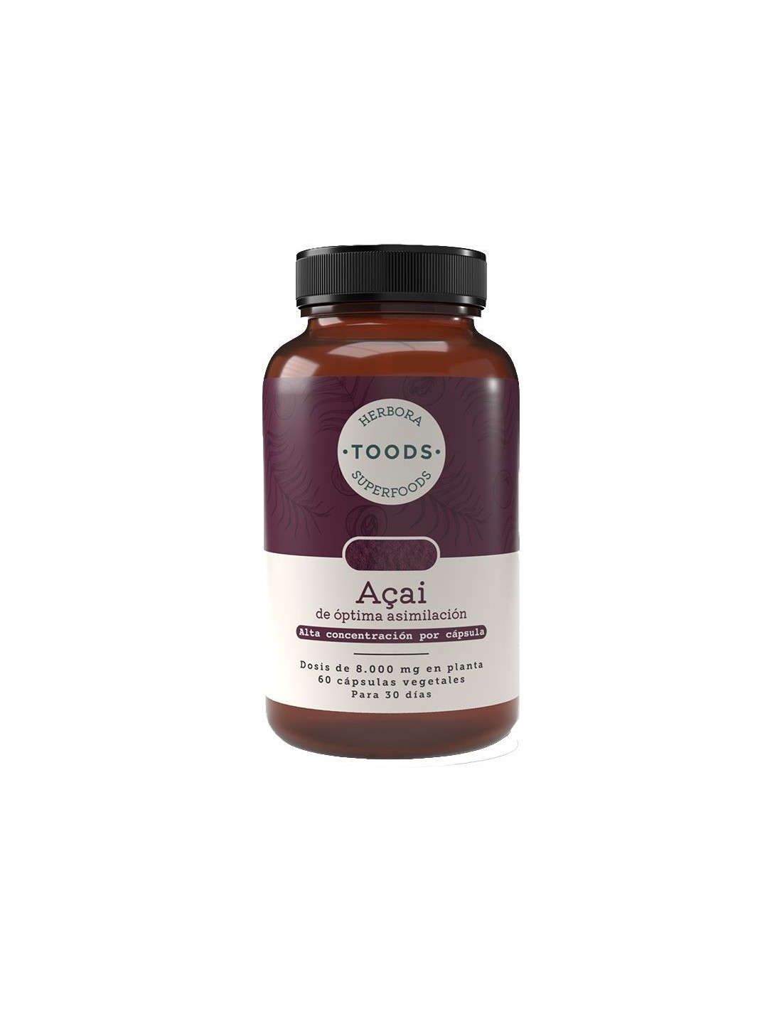 Açai de Herbora Toods Superfoods es un producto que contiene extracto seco de açai (Euterpe oleracea), una fruta morada originaria de la selva amazónica, considerada un superalimento por sus propiedades antioxidantes. Ayuda a proteger la piel del envejecimiento celular, promueve la salud cardiovascular, refuerza el sistema inmunológico y mejora la digestión debido a su alto contenido en fibra.Por otro lado, el açai es rico en fitoesteroles, que contribuyen a la salud cardiovascular, y en vitaminas A, C y del grupo B. También es una fuente destacada de calcio y diversos minerales como el magnesio y el hierro.Por último, su contenido en grasas saludables como los ácidos grasos omega 3, 6 y 9, son beneficiosas para el corazón al reducir los niveles de colesterol LDL (colesterol malo) y promover la salud arterial.Composición activa por dosis diaria (2 cápsulas):1.000 mg de extracto seco de açai (equivalente a 8.000 mg en planta).Ingredientes:Açai (Euterpe oleracea), agente de carga (celulosa microcristalina), antiaglomerantes (sales magnésicas de ácidos grasos y dióxido de silicio).Modo de empleo:Tomar 2 cápsulas al día, preferiblemente por la mañana en ayunas con un vaso grande de agua (250 ml).Presentación:Envase de 60 cápsulas vegetales.Recomendaciones y advertencias:Producto vegano. No contiene lactosa ni gluten. Consultar al médico en caso de estar embarazada, en periodo de lactancia o bajo tratamiento médico. No usar en caso de alergia a alguno de los componentes.