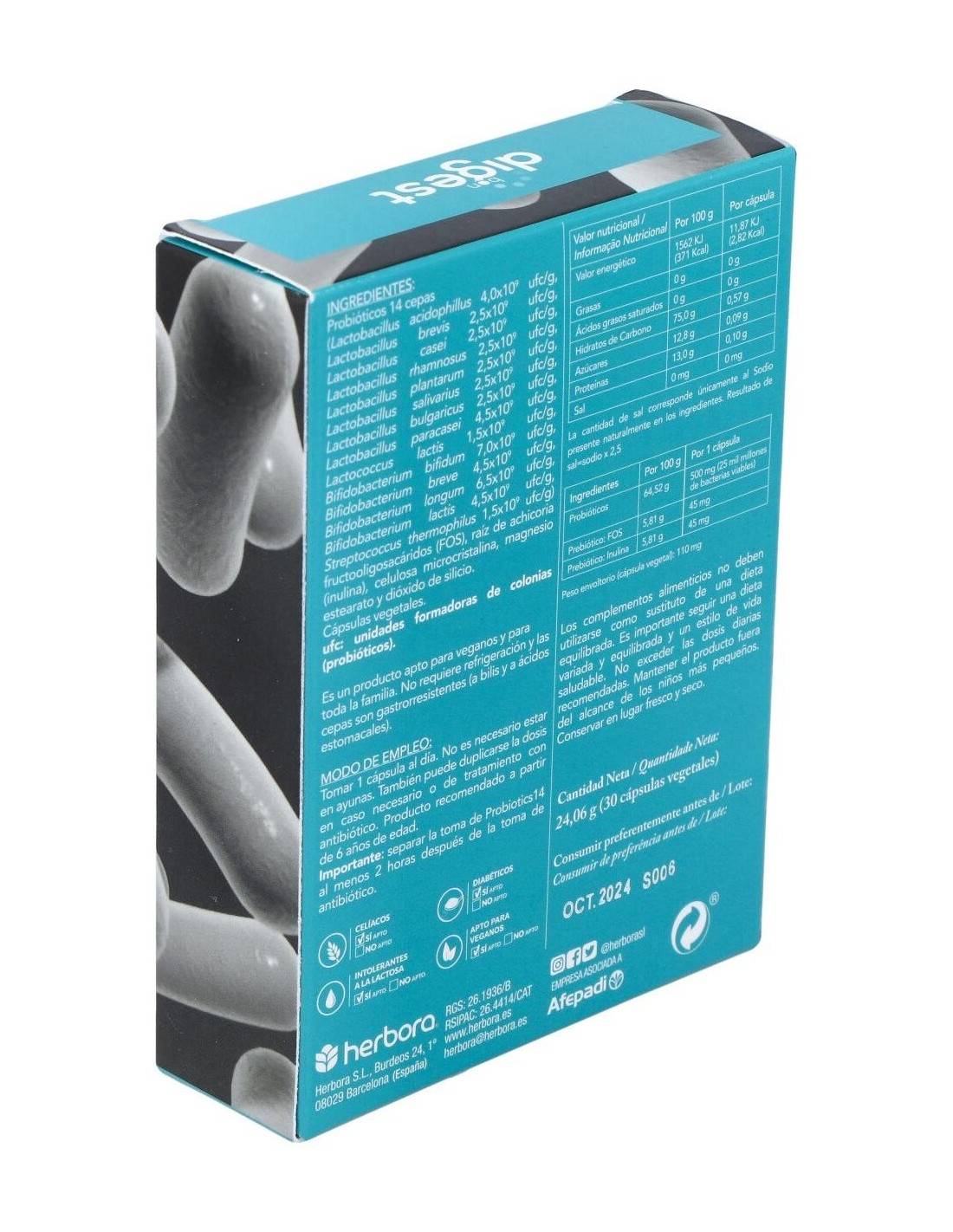 HERBORAProbiotics 14 de Herbora es un suplemento probiótico diseñado para personas que buscan apoyar su salud digestiva. Ofrece una fórmula con 14 cepas bacterianas que contribuyen al equilibrio natural del microbioma intestinal.