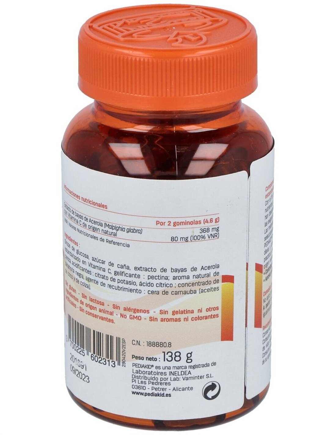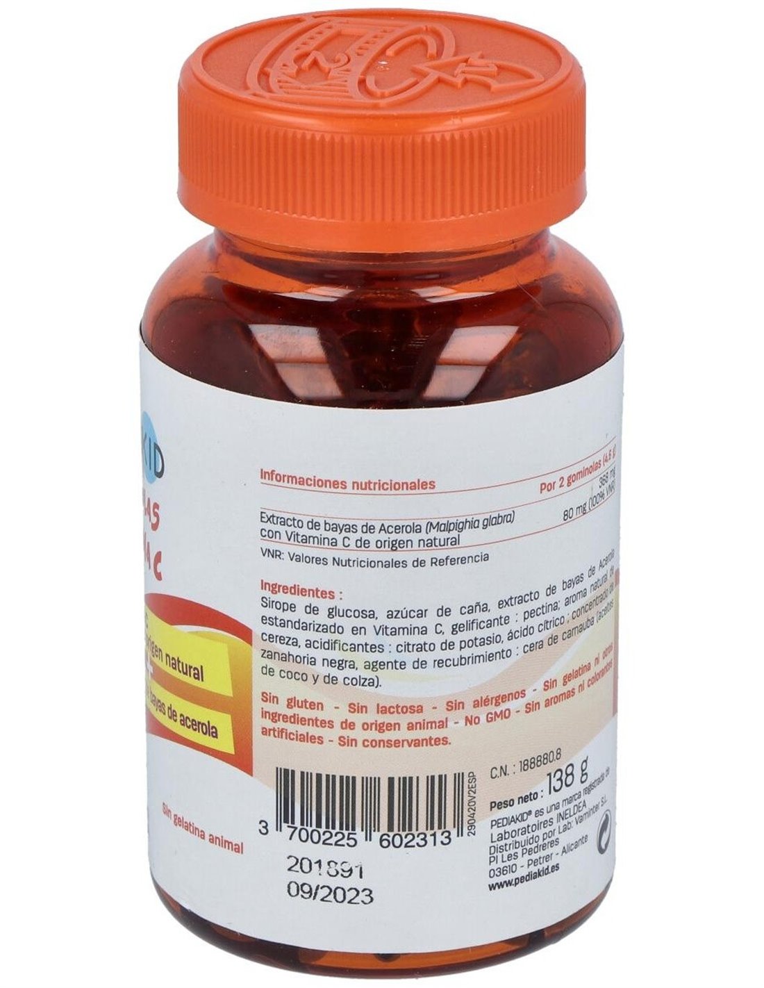 Complemento alimenticio en forma de gominolas a base de extracto de bayas de Acerola titulado en Vitamina C, con extracto de bayas de Acerola, rico en Vitamina C 100% de origen natural de biodisponibilidad óptima, las Gominolas Vitamina C de Pediakid® permiten cubrir el 100% de los aportes de referencia en Vitamina C y así contribuir a la reducción de la fatiga y al mantenimiento del metabolismo energético y de las defensas naturales del organismo.Composición activa por 2 gominolas:368 mg de extracto de bayas (80 mg de vitamina C).Ingredientes:Sirope de glucosa, azúcar de caña cristalizado, extracto de bayas de Acerola titulado en Vitamina C, aromatizante natural, colorante natural: concentrado de zanahoria, agente de recubrimiento: cera de carnauba (aceites de coco y de colza).Modo de empleo:Desde los 3 años. 2 gominolas al día. También puede ser conveniente para mayores de 15 años.Presentación:Envase de 60 gominolas masticables.Recomendaciones y advertencias:No contiene gelatina, conservantes, gluten, lactosa, sabores o colorantes artificiales.