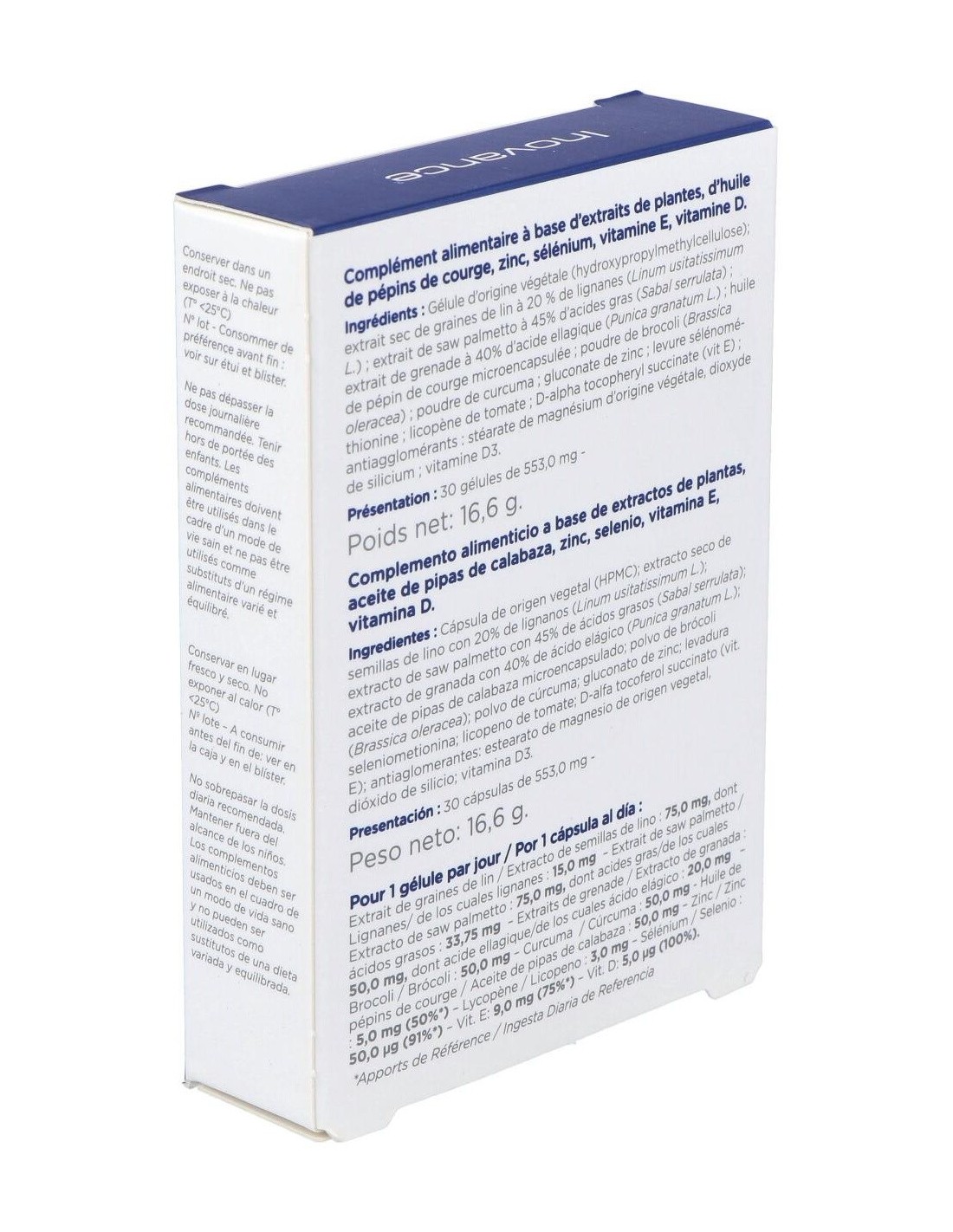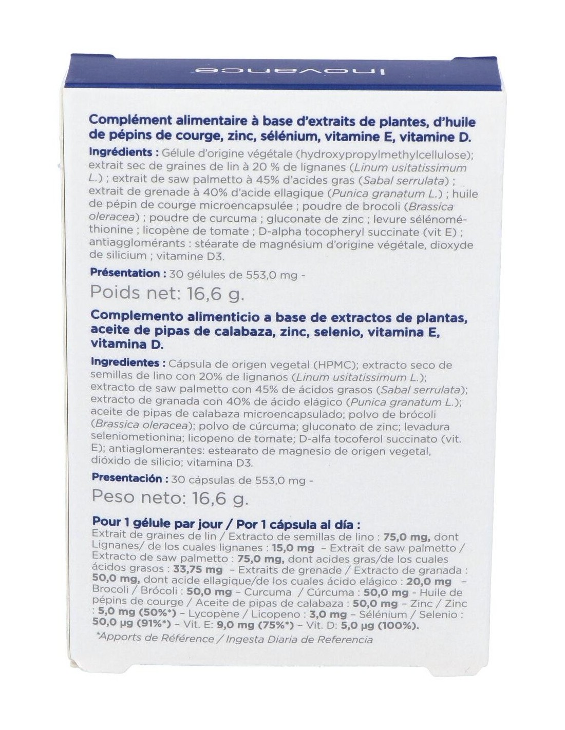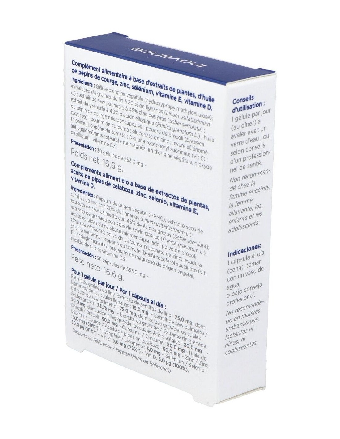 Complemento alimenticio a base de extractos de plantas, aceite de pepitas de calabaza, zinc, selenio, vitaminas C-E y vitamina D que contribuye al confort urinario del hombre a partir de los 50 años.