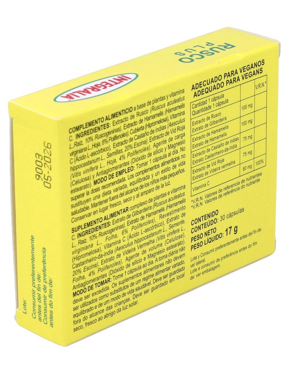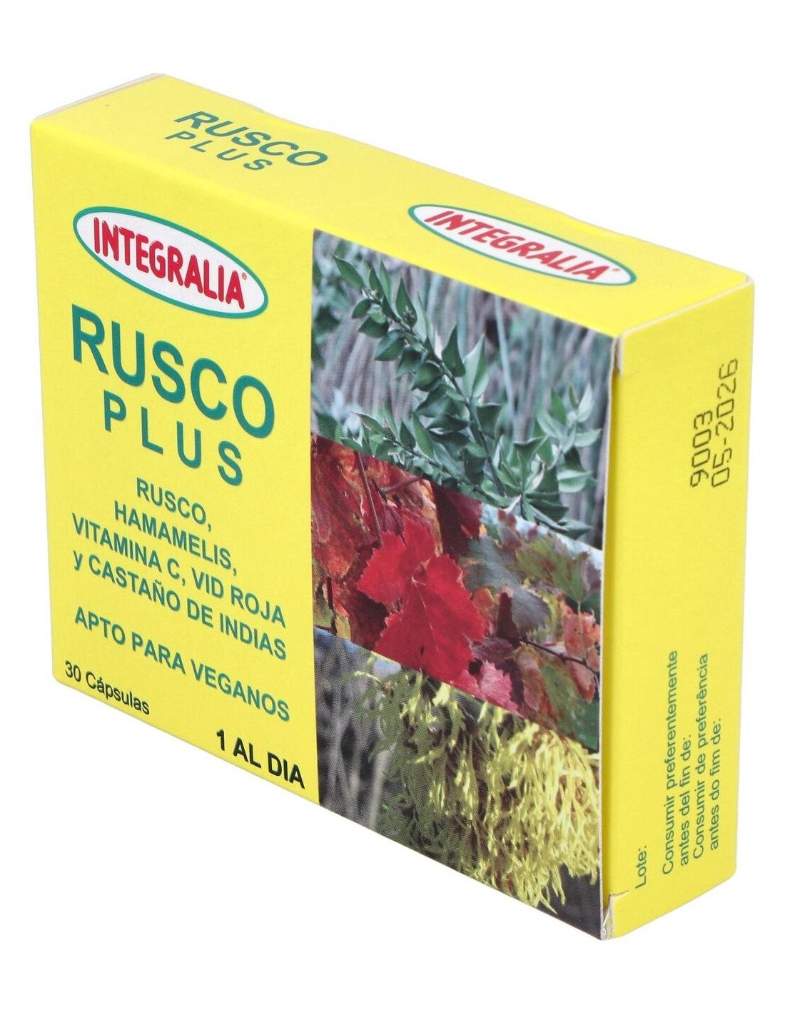 INTEGRALIARusco Plus 30Cap. de Integralia es un complemento alimenticio para personas que buscan apoyar la salud circulatoria. Con extracto de rusco, contribuye al bienestar vascular de forma natural.