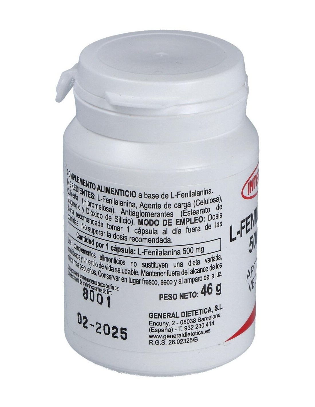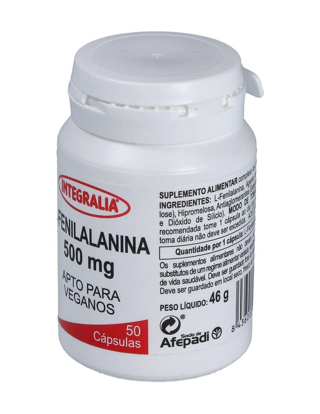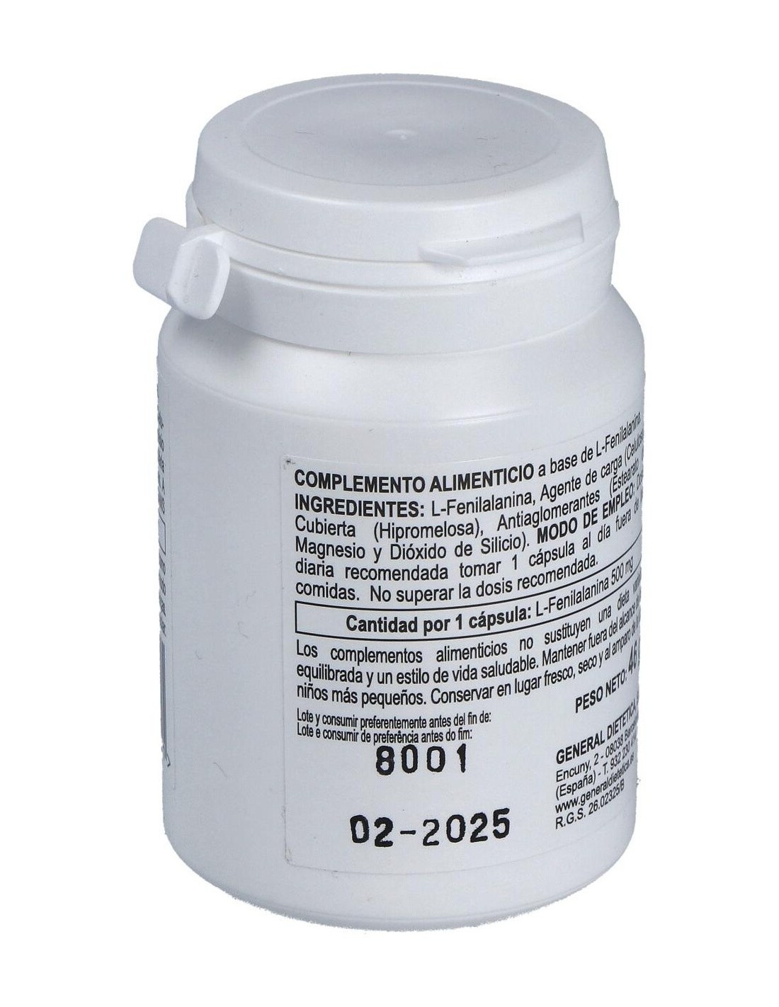- Cada cápsula contiene L-fenilalanina, un aminoácido esencial que contribuye a la síntesis de proteínas en el organismo.