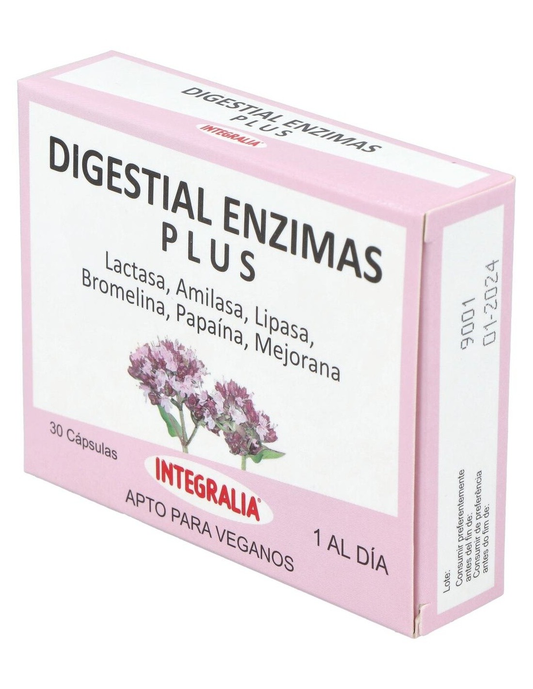 Extracto de Mejorana (Origanum majorana L., Sumidad florida) 100 mg ,Papaína 100 mg actividad enzimática 10.000 TU, Bromelina 100 mg actividad enzimática 120 GDU, Amilasa 24 mg (procedente de fermentación de trigo) actividad enzimática 2.160 DU, Lactasa 45 mg actividad enzimática 4.500 FCC,y Lipasa 14 mg (procedente fermentación de soja) actividad enzimática 2.100 FIP.