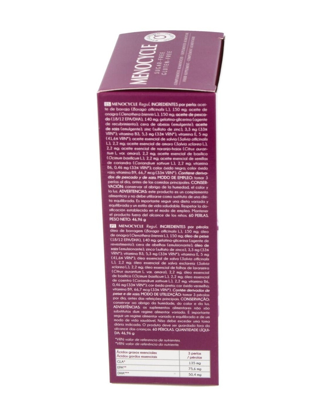 Ingredientes:aceite de borraja (Borago officinalis L.)(150 mg), aceite de onagra (Oenothera biennis L.)(150 mg), aceite de pescado (18/12 EPA/DHA)(140 mg), gelatina-glicerina (agente de recubrimiento); cera de abejas (emulgente); aceite de soja (emulgente); zinc (sulfato de zinc)(3,3 mg), vitamina B3,(5,3 mg), vitamina E (5 mg), aceite esencial de salvia (Salvia officinalis L.)(2,2 mg), aceite esencial de amaro (Salvia sclarea L.)(2,2 mg), aceite esencial de naranjo-hojas (Citrus aurantium L. var. amara)(2,2 mg), aceite esencial de basílico (Ocimum basilicum L.)(2,2 mg), aceite esencial de semillas de coriandro (Coriandrum sativum L.)(2,2 mg), vitamina B6 (0,46 mg), color óxido negro; color óxido rojo; vitamina B9 (66,7 mcg).Modo de empleo:Tomar 3 perlas al día, una antes de cada comida.Presentación:Envase de 60 perlas.Recomendaciones y advertencias:Apto para veganos. No contiene azúcares ni gluten. Contiene derivados de pescado y de soja.