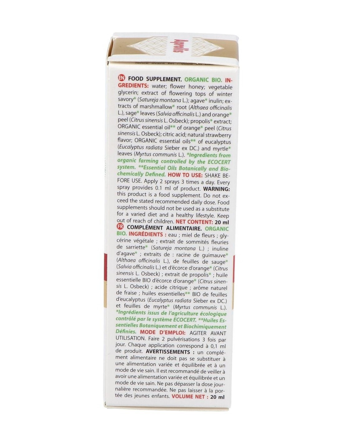 Spray bucal formulado a base de propóleo, salvia y malvavisco. Contiene aceites esenciales de naranjo y eucalipto. Favorece la sensación de alivio y confort en la garganta. Es usado en afecciones leves de la garganta producida por el catarro o resfriado común. Indicado para niños.
