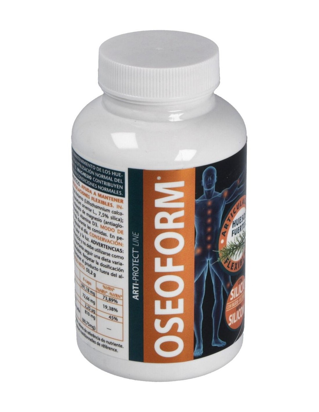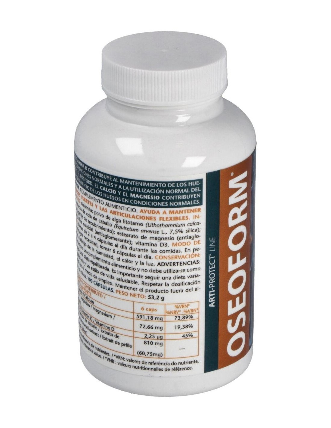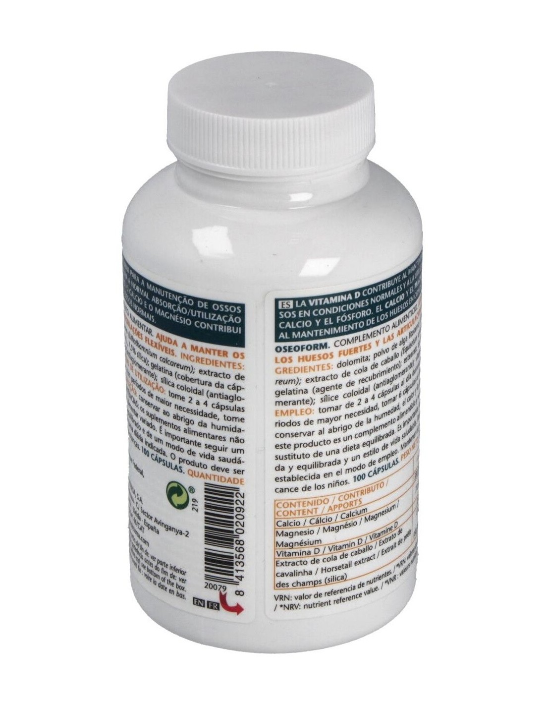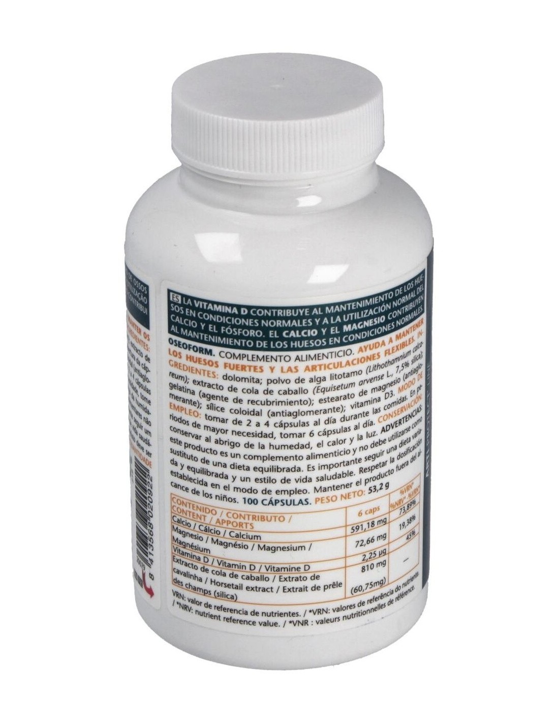 Este producto contiene ingredientes ricos en magnesio y calcio como la dolomita (roca caliza natural de estructuras cristalinas y también contiene pequeñas dosis de otros minerales), alga litotamo (alga roja que crece en aguas claras, al abrigo de la contaminación, en el Atlántico Norte, el mar del Norte, el canal de la Mancha y el Mediterráneo, de color violáceo cuando está viva, y de color blanca cuando muere). El litotamo es muy rica en micronutrientes, oligoelementos, minerales como el calcio, magnesio, molibdeno, hierro, flúor, fósforo, potasio, yodo, zinc, selenio y cobalto, además contiene vitaminas y aminoácidos. La cola de caballo rica en silicio ayuda a fijar el calcio, por lo que el cuerpo puede almacenar más cantidad de este mineral y consigue formar huesos y tendones en mejor estado. Ingredientes: