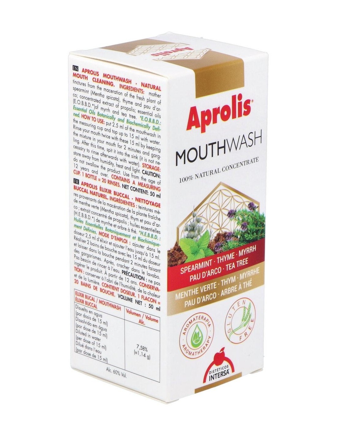Ingredientes (INCI):Mentha Viridis (Spearmint) Extract, Thymus Vulgaris (Thyme) Extract, Lavandula Angustifolia (Lavender) Extract, Tabebuia Impetiginosa Extract, Propolis Extract, Commiphora Myrrha Oil, Melateuca Alternifolia (Tea Tree) Oil.Modo de empleo:Añadir al dosificador la cantidad de 2,5 ml de elixir, continuar añadiendo agua hasta los 15 ml. Dejar en la boca la mezcla durante 2 minutos, gargareando por toda la zona bucal. Pasado este tiempo, eliminar en lavabo. No es necesario enjuagar a posteriori con agua. Precaución: no ingerir el producto. Realizar 2 enjuagues de los 15 ml del dosificador. Presentación:Frasco de 50 ml con dosificador.Recomendación y advertencias:No contiene: Gluten ni azúcares.