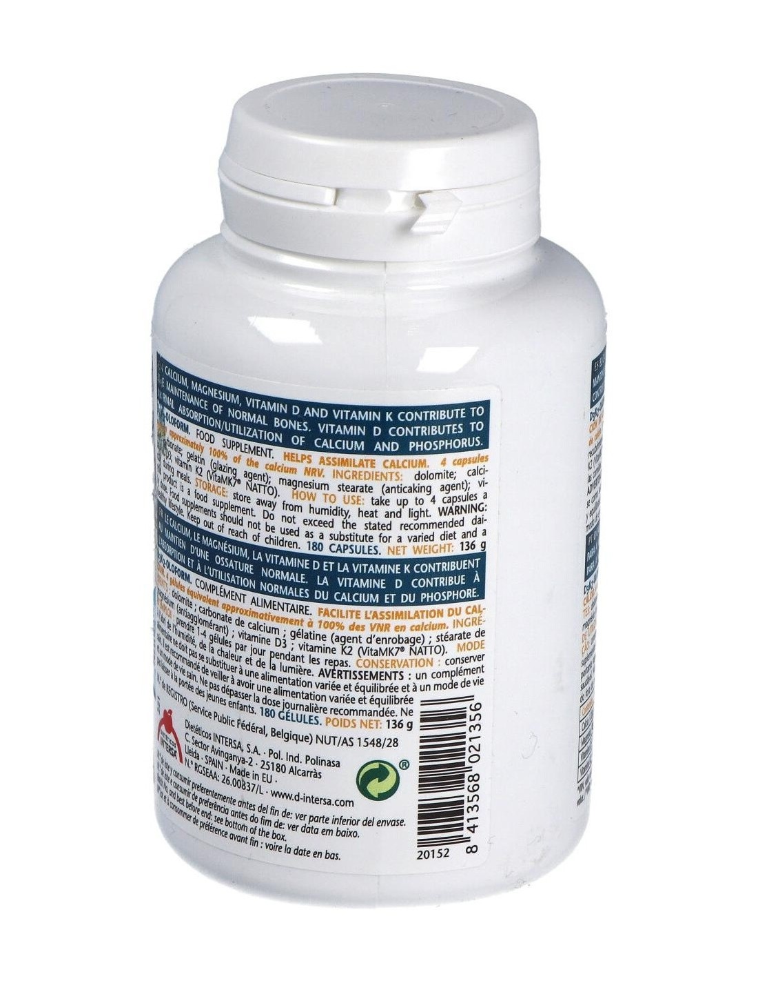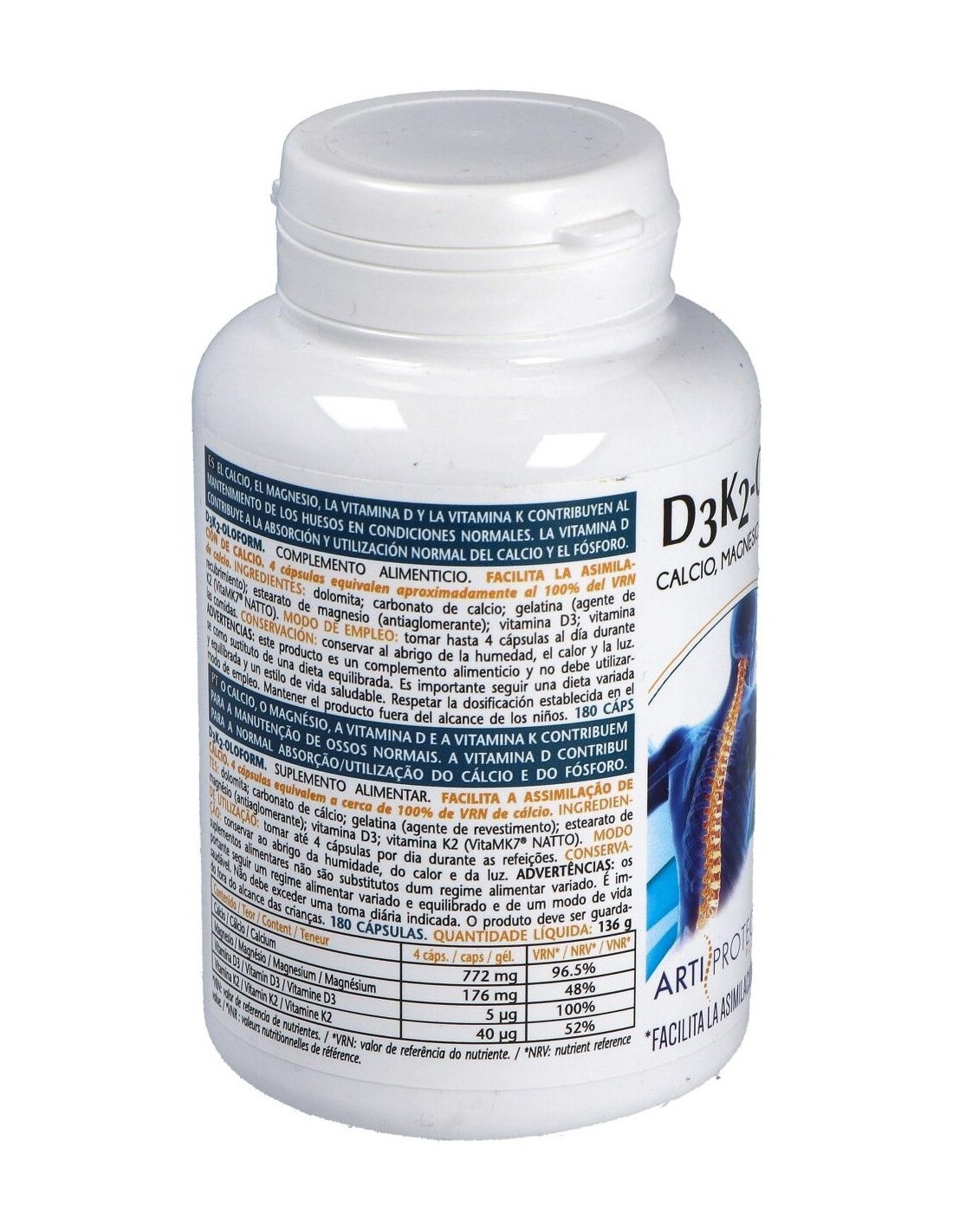 Este producto es un complemento nutricional para la corrección del déficit de calcio, por una dieta inadecuada o por aumento de la demanda (lactantes, ancianos). Ideal para descalcificación, osteoporosis, osteomalacia, dolores musculares y articulares asociados a descalcificación, hipocalcemia, déficit de vitamina D3 y déficit de vitamina K.Ingredientes:
