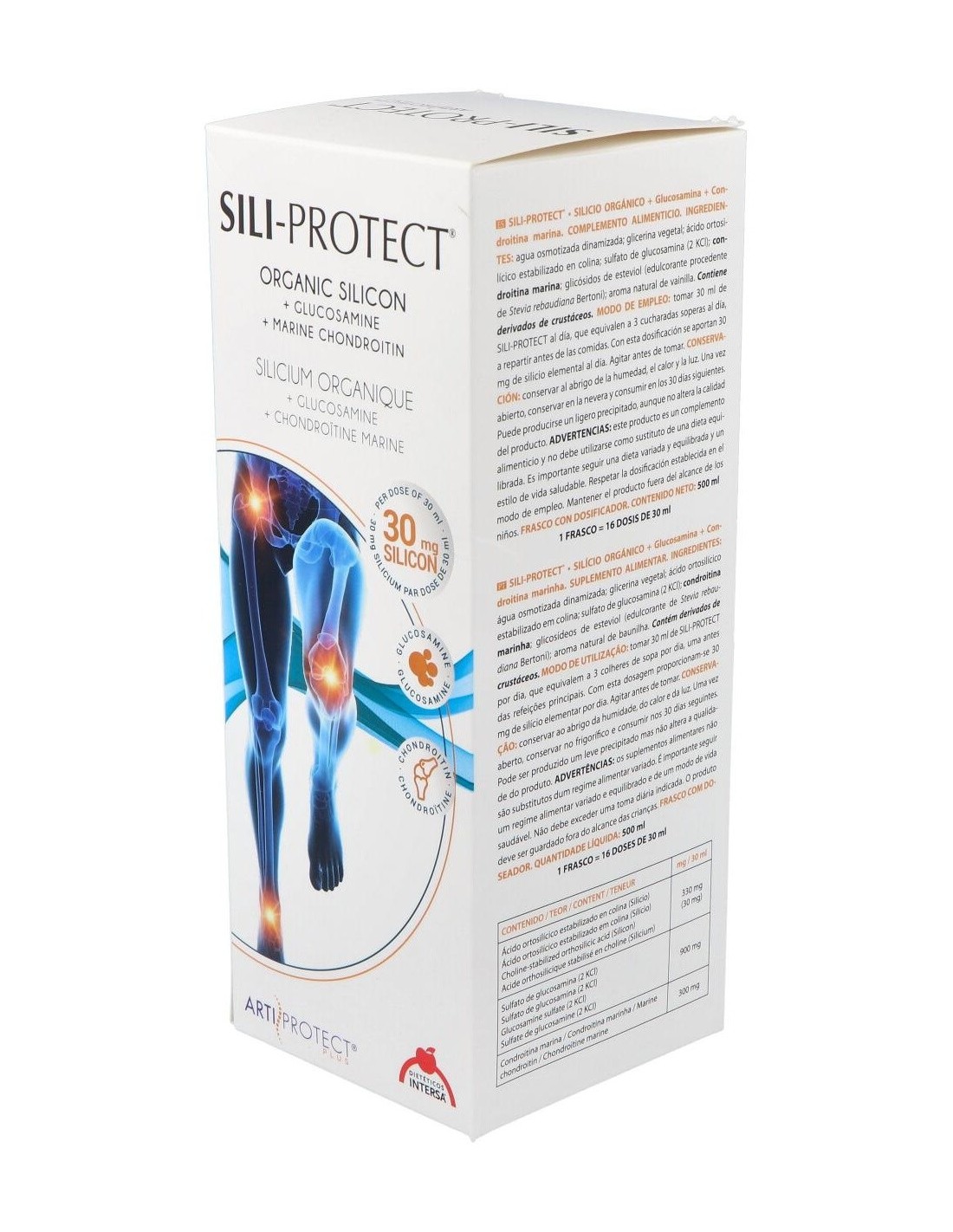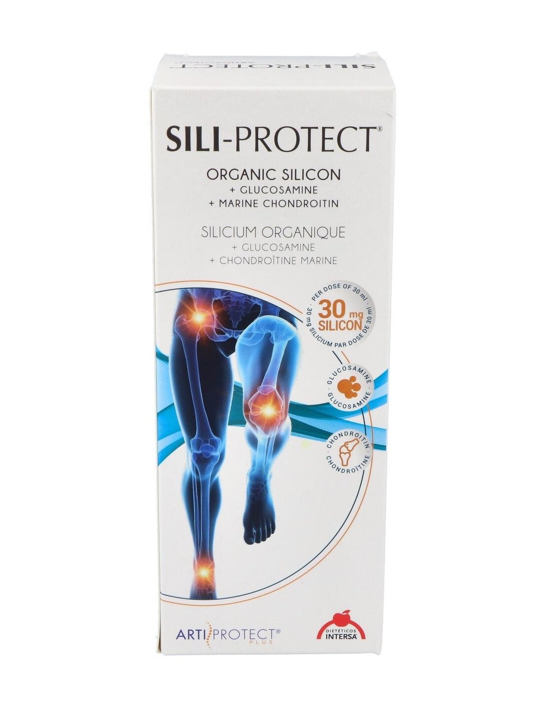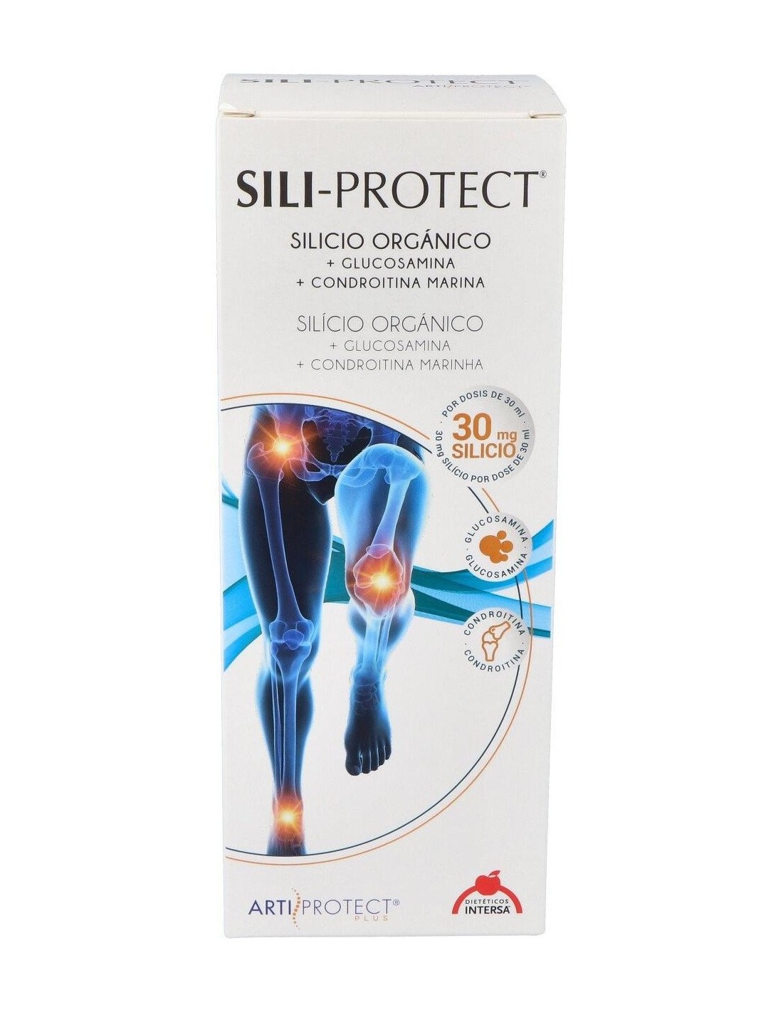INTERSASili-Protect jarabe es un complemento nutricional que aporta al cartílago articular silicio orgánico, azufre, glucosamina y condroitina marina, actúan