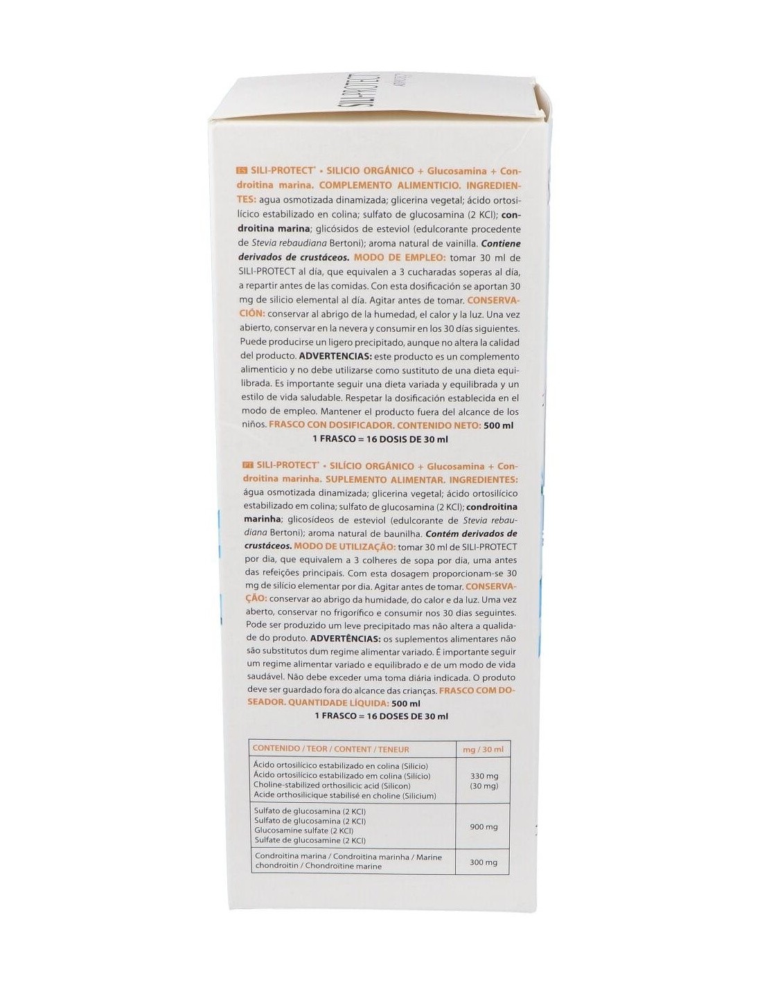 Modo de empleo:Tomar 30 ml al día, que equivalen a 3 cucharadas soperas al día, a repartir antes de las comidas. Disolver el contenido en un poco de agua y tomar. Con esta dosificación se aporta 30 mg de silicio elemental al día.Presentación:Frasco de 500 ml con dosificador.