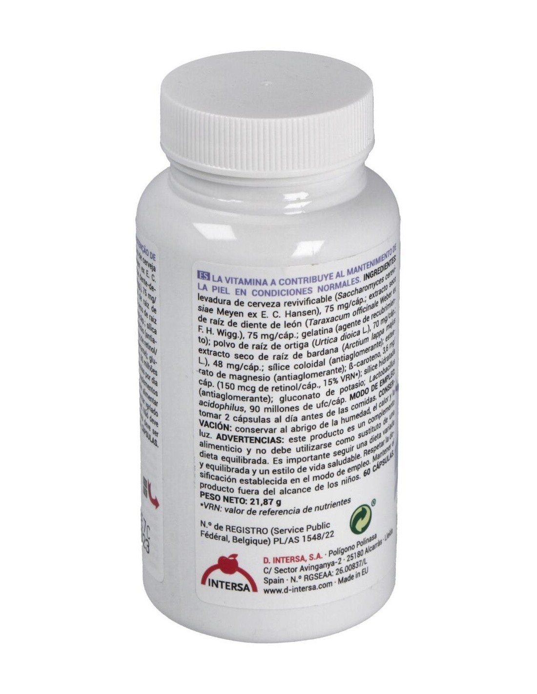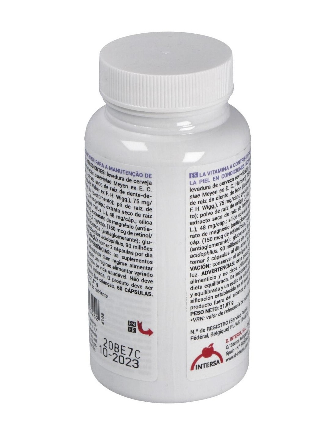 INTERSAEste complemento nutricional está destinado a la depuración del organismo, acné juvenil y acné purulento, regulación de la secreción sebácea, caspa, e
