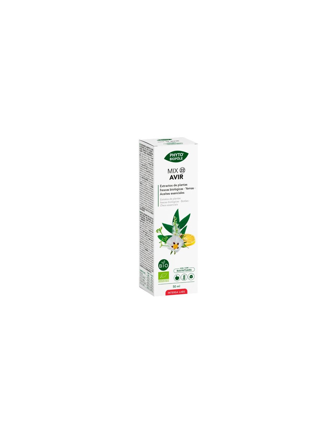 Phyto-Biopole Mix Avir 22 Bio es un complemento alimenticio formulado con extracto de Cistus (Cistus incanus × creticus subsp. eriocephalus) en forma líquida, que ha demostrado cientificamente su efecto antiviral a través de la inhibición de la enzima neuraminidasa a dosis dependiente y, con ello, su efecto antigripal o inhibidor de la infección por el virus de la influenza.Combina el extracto de Cistus incanus con una sinergia de aceites esenciales: ravintsara, niaouli, cajeput y cáscara de limón. Este complejo de aceites esenciales actúa como antimicrobiano de amplio espectro, analgésico, descongestivo y febrífugo.Todos estos ingredientes lo convierten en un suplemento alimenticio de primera elección para el tratamiento de las infecciones virales, bacterianas y fúngicas que afectan a las vías respiratorias sobretodo cuando existe afección de la esfera broncopulmonar, por sus beneficios descongestivos.Indicaciones:
