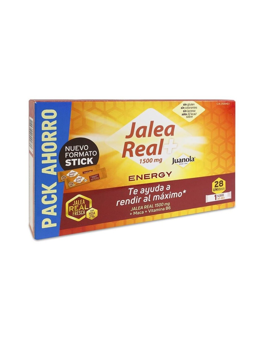JUANOLAJuanola Jalea Real Energy es un complemento alimenticio con jalea real fresca, extracto seco de maca y vitamina B6, en formato sticks unidosis. La B6 contribuye al metabolismo energético normal, al funcionamiento normal del sistema inmunitario y ayuda a disminuir el cansancio y la fatiga. Además, contiene maca que favorece el rendimiento físico y mental, aportando energía y manteniendo la vitalidad del organismo.