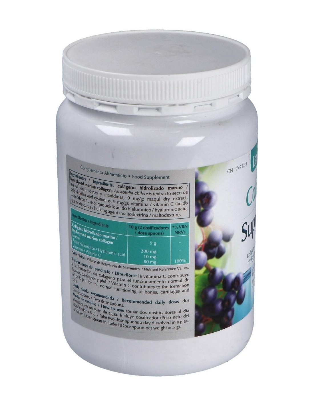 Preparado a base de colágeno marino hidrolizado de la más alta calidad, combinado con ácido hialurónico para reforzar la acción redensificante del tejido dérmico, y reparadora del tejido cartilaginoso. La incorporación del extracto de maqui, una baya de origen chileno con propiedades revitalizantes y muy rica en polifenoles, le proporciona una importante acción antioxidante para proteger las estructuras dérmicas y articulares de la acción destructora de los radicales libres. Contiene también vitamina C que, además de contribuir a la lucha contra la oxidación, es necesaria para la síntesis de colágeno por los fibroblastos. Este suplemento se ha formulado para tratar los signos de envejecimiento de la piel y de las articulaciones.