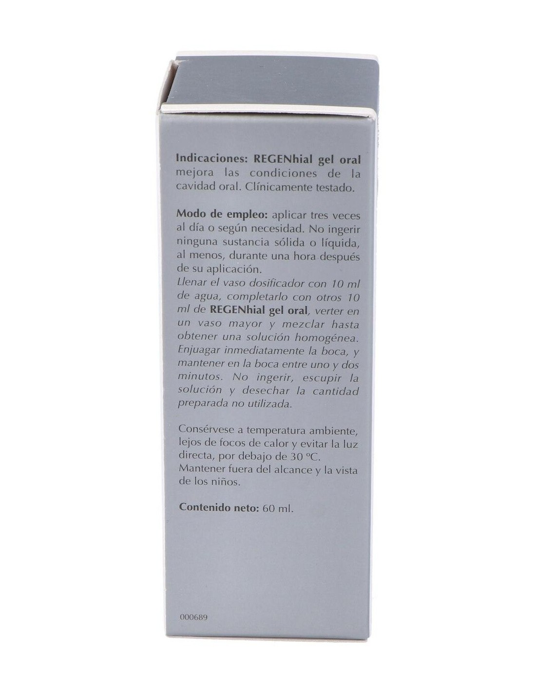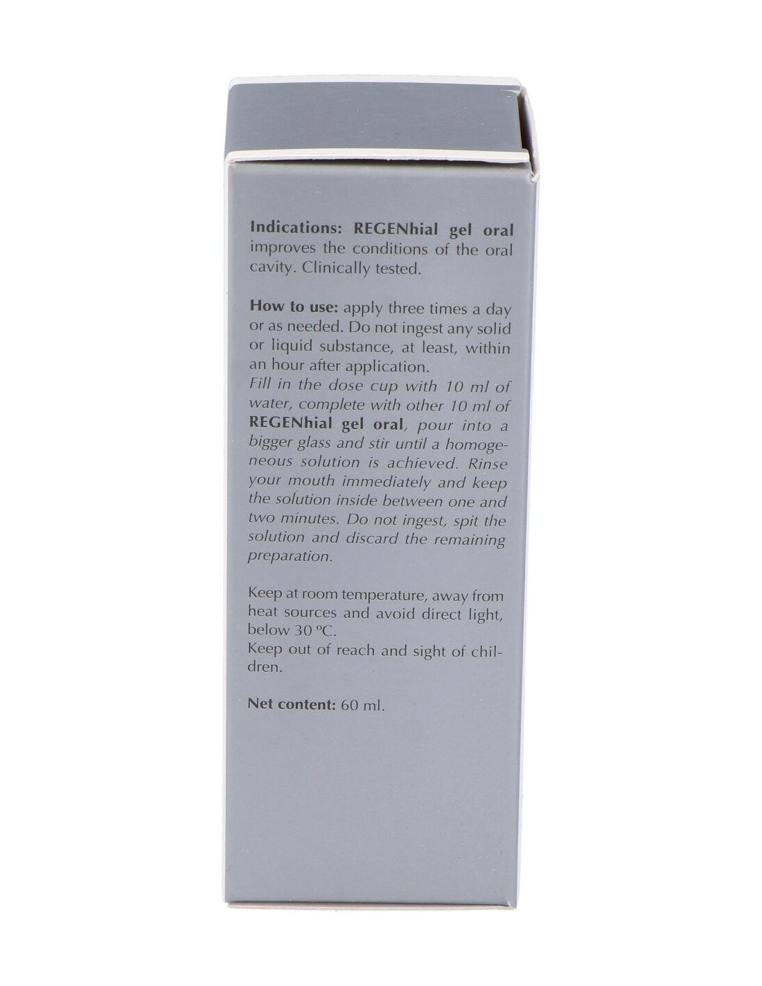 Aplicar tres veces al día o según necesidad. No ingerir ninguna sustancia sólida o líquida, al menos, durante una hora después de su aplicación. Llenar el vaso dosificador con 10 ml de agua, completarlo con otros 10 ml de REGENhial Gel Oral, verter en un vaso mayor y mezclar hasta obtener una solución homogénea. Enjuagar inmediatamente la boca, hacer gárgaras y mantener en la boca entre uno y dos minutos, asegurando un recubrimiento completo. No ingerir, escupir la solución y desechar la cantidad preparada no utilizada.