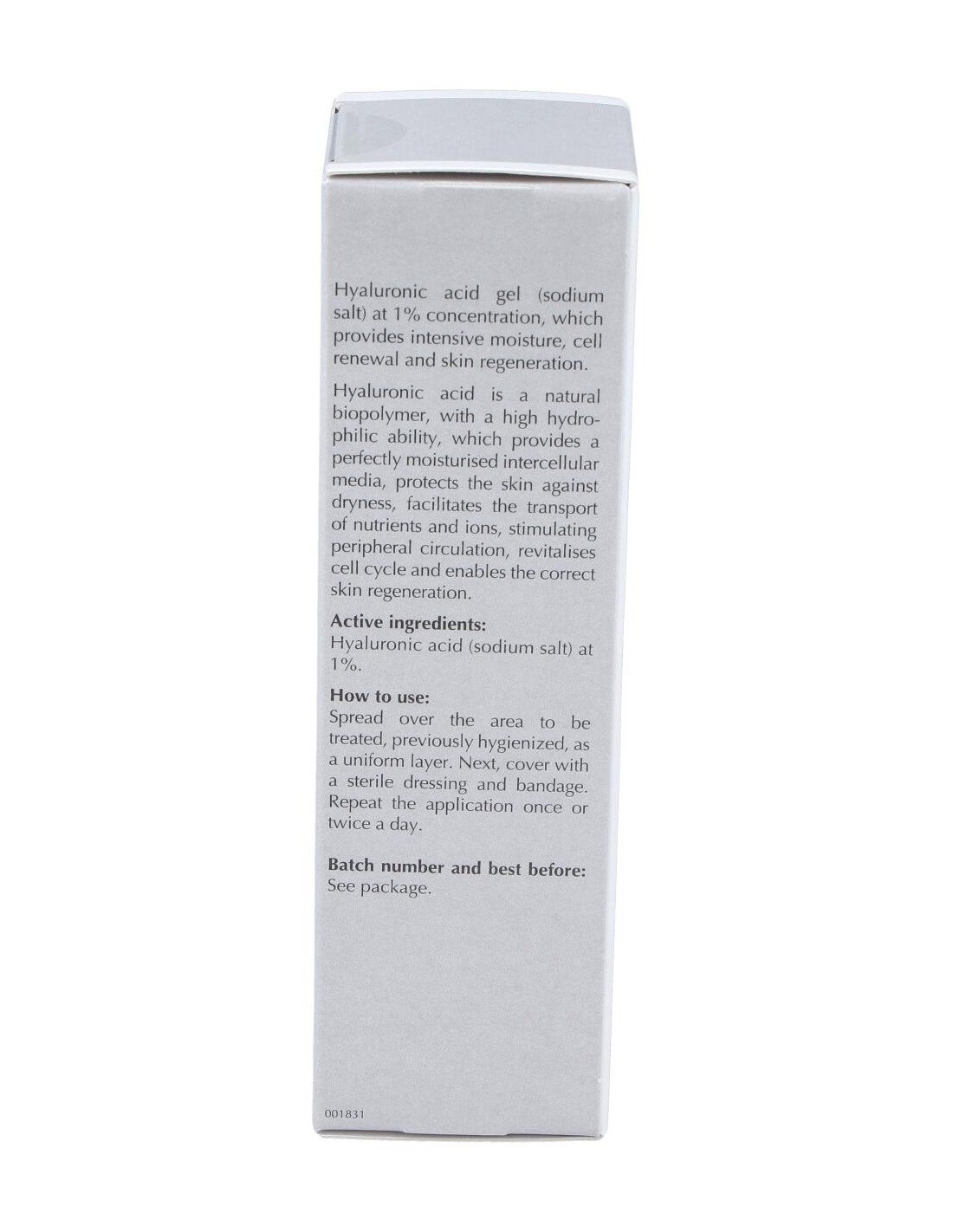 Gel de ácido hialurónico al 1% que proporciona hidratación intensiva, renovación celular y regeneración cutánea. El ácido hialurónico es un biopolímero natural, con una elevada capacidad hidrofílica, que proporciona un medio intercelular perfectamente hidratado, protege la piel contra la sequedad, facilita el transporte de nutrientes e iones, estimulando la circulación periférica, revitaliza el ciclo celular y posibilita una correcta regeneración cutánea.