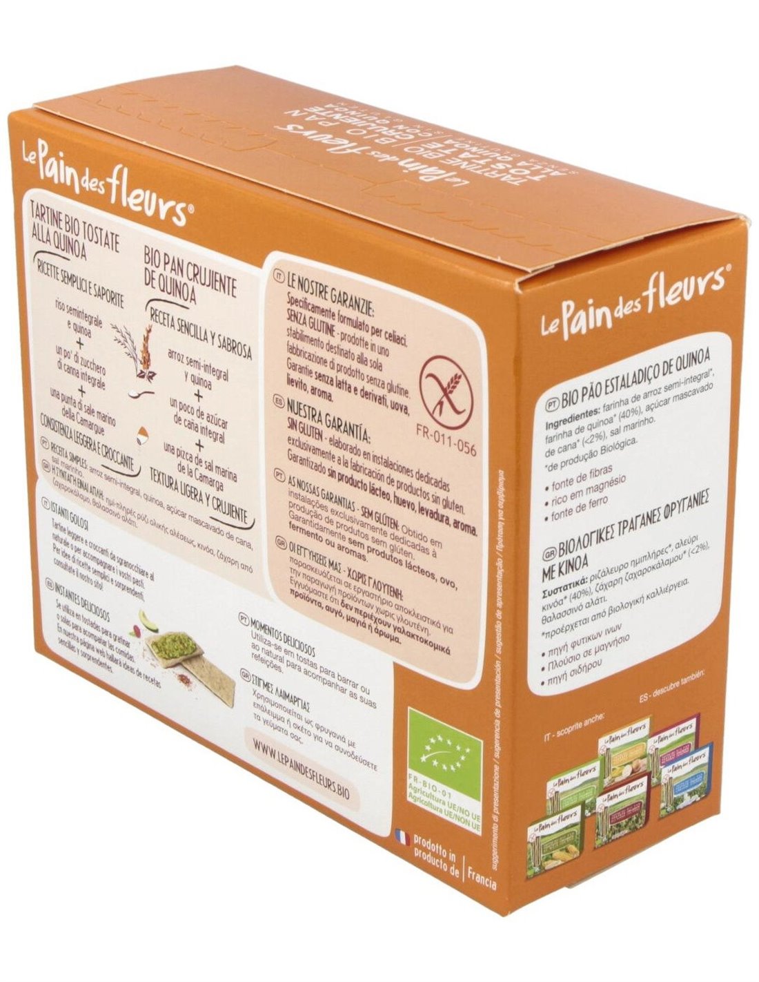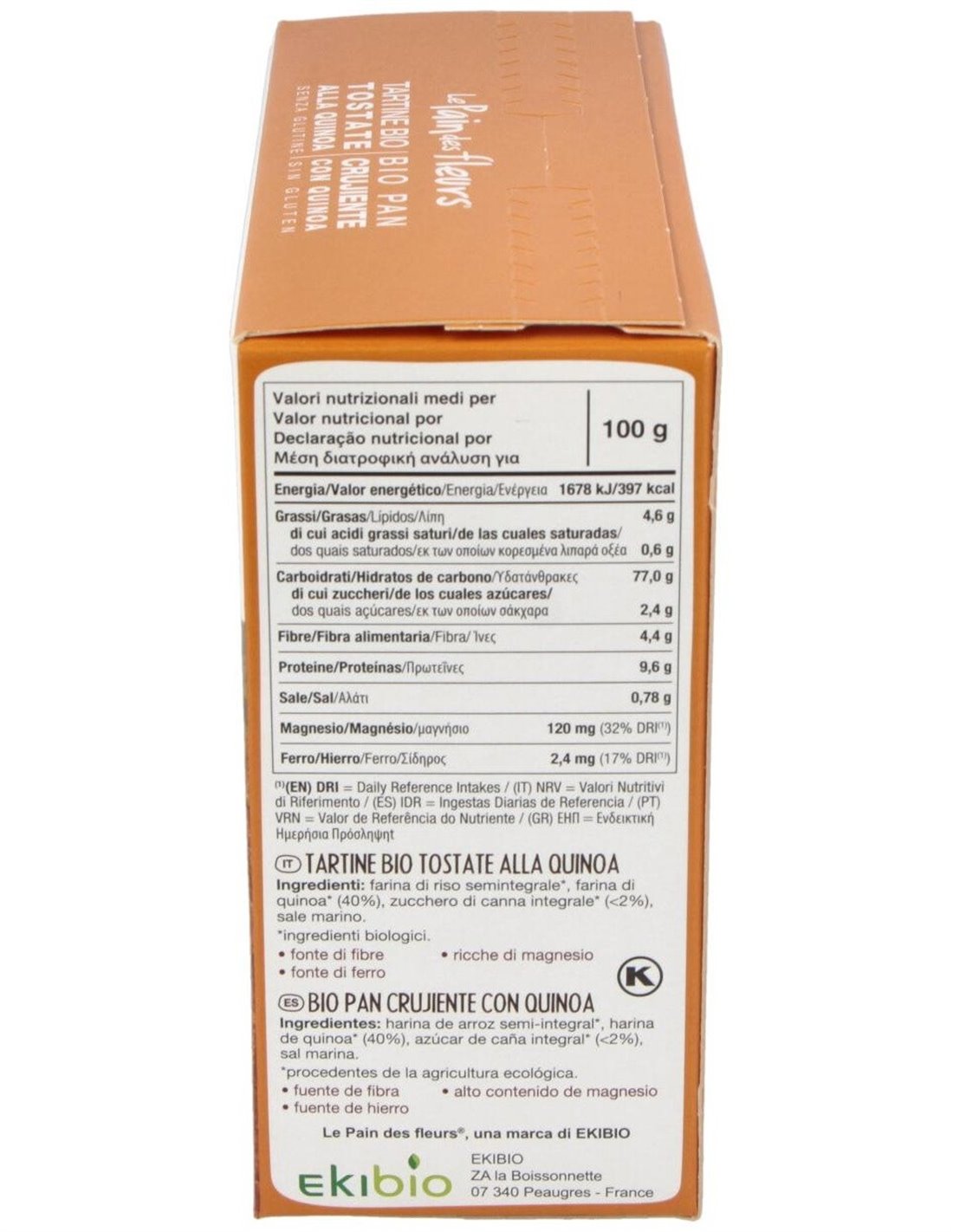 LE PAIN DES FLEURSIngredientes:Harina de arroz semi-integral*, harina de quinoa* (40%), azúcar de caña integral* (<2%), sal marina. (*) Ingredientes procedentes de la a