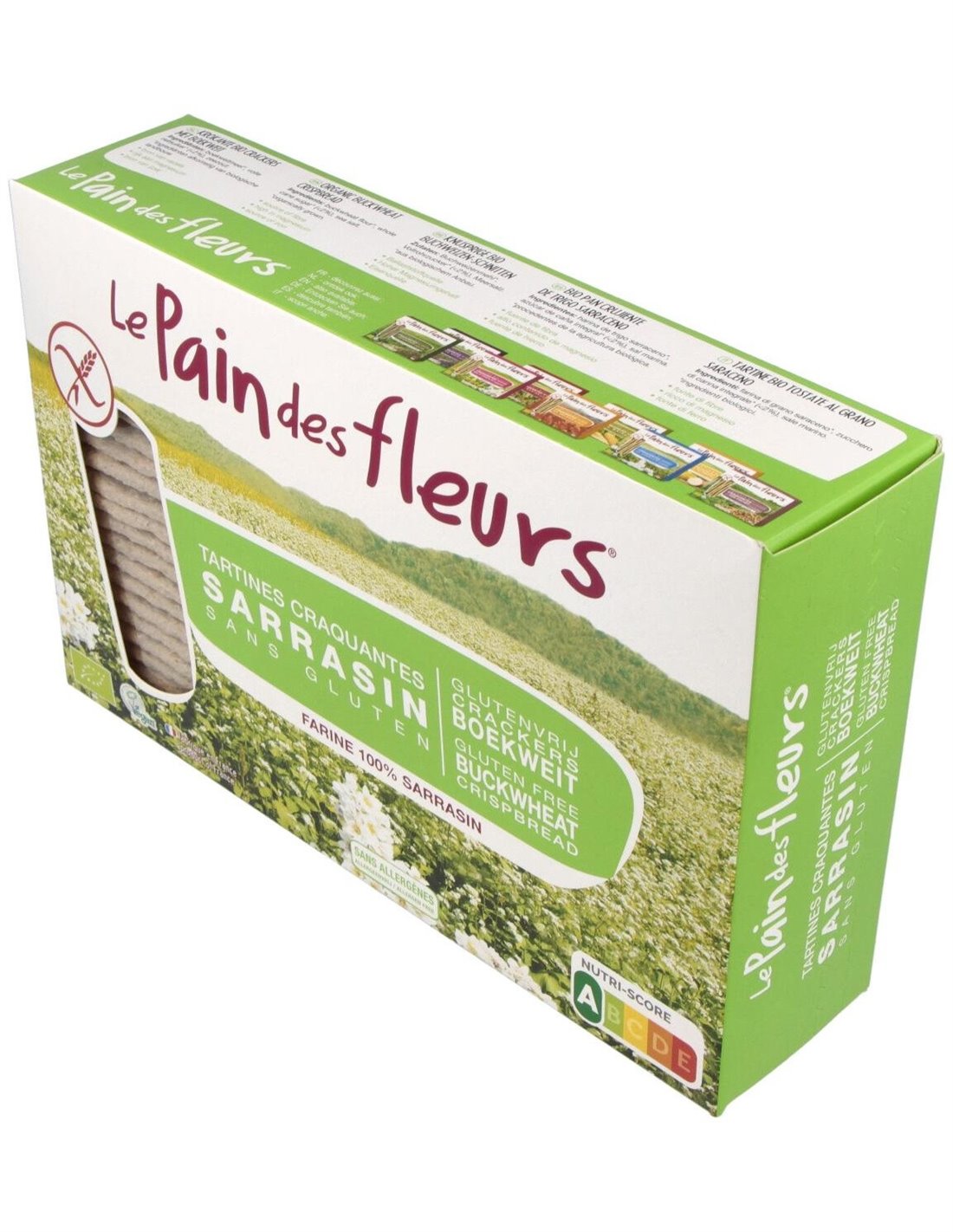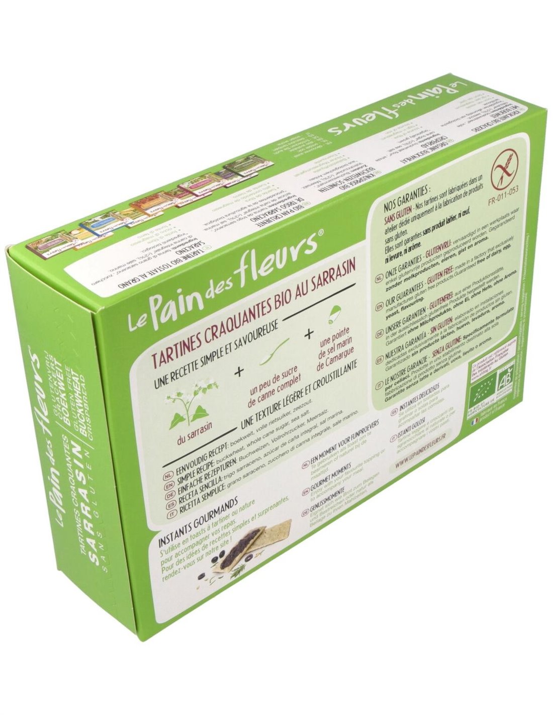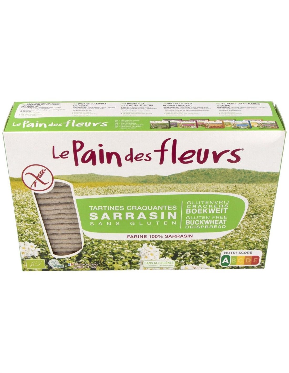 LE PAIN DES FLEURSIngredientes:Harina de trigo sarraceno*(97,6%), azúcar de caña integral* (<2%), sal marina. (*) Ingredientes procedentes de la agricultura ecológica.V