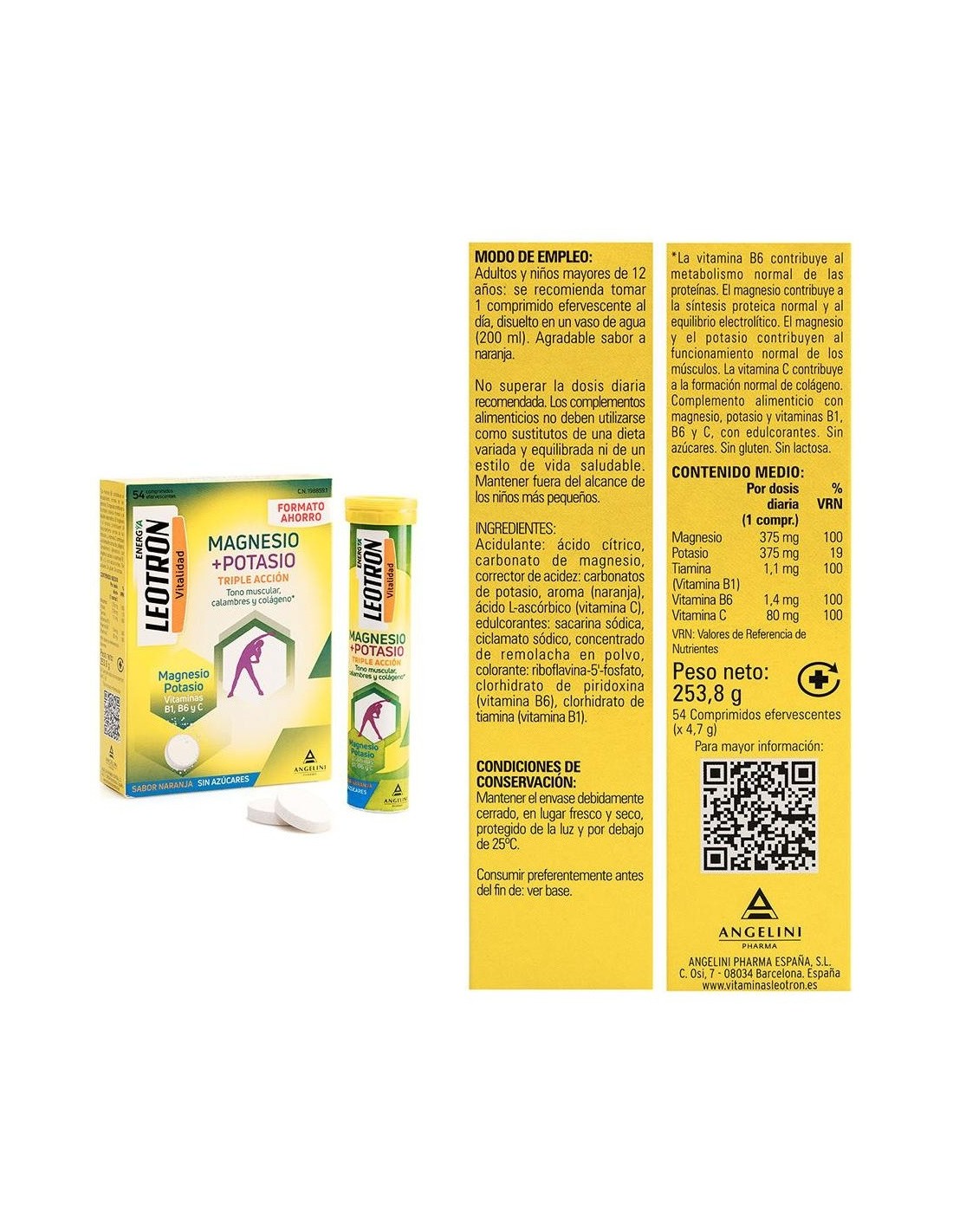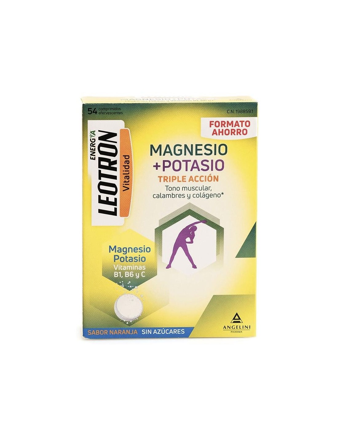 LEOTRONComprimidos efervescentes de sabor naranja y sin azúcares con triple acción. El magnesio y el potasio contribuyen al funcionamiento normal de los músculos. El magnesio ayuda a la síntesis proteica normal y al equilibrio electrolítico. La vitamina C contribuye a la formación normal de colágeno. La vitamina B6 ayuda al metabolismo normal de las proteínas.