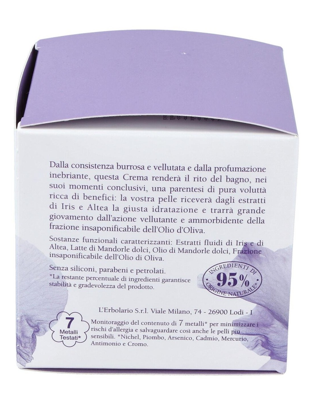 Emulsión muy rica y aterciopelada con una fragancia embriagadora. La piel recibe la hidratación adecuada de los extractos de Iris y Altea y se beneficia de la acción aterciopelada y suavizante del aceite de oliva. Sin siliconas, parabenos ni vaselina.