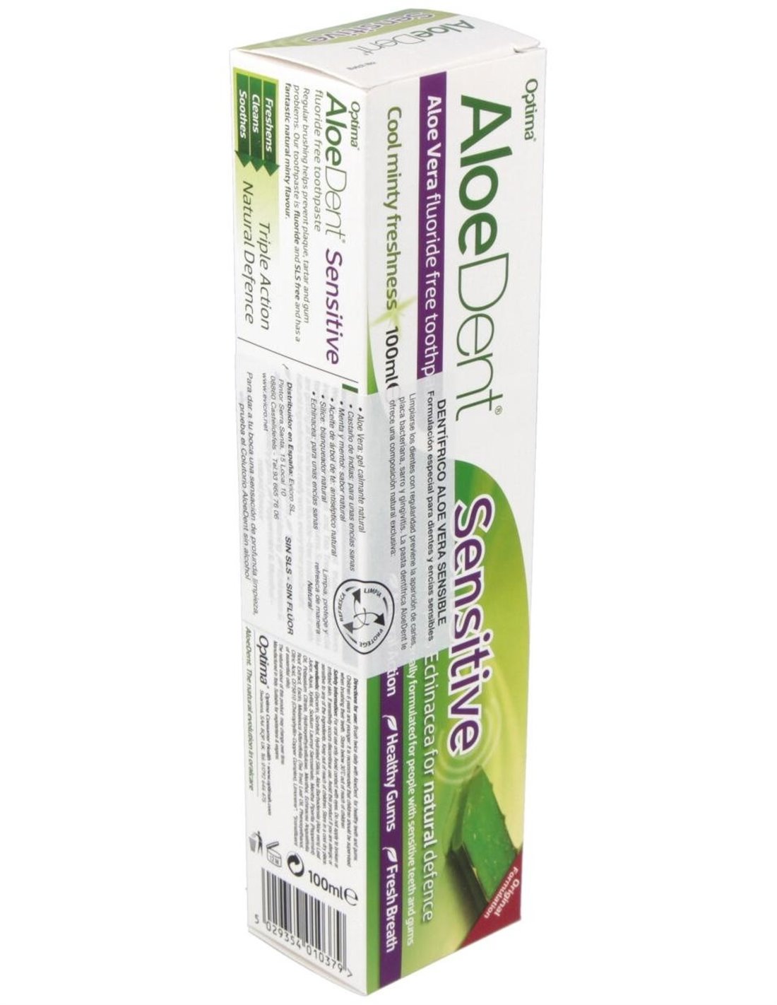 Dentífrico Aloe Dent Sensitive de Evicro es un producto especialmente indicado para dientes y encías sensibles.?Tiene propiedades bactericidas y un efecto calmante instantáneo. Limpia y protege los dientes.Ingredientes (INCI):Glycerin (origen vegetal), Sorbitol (origen vegetal), Hydrated Silicia (origen mineral), Aloe Barbadensis, Aqua, Sodium Lauroyl Sarcosinate (derivado proteico), Mentha Piperita (aceite de hierbabuena), Xanthal Gum (origen natural) Mentol (origen natural), Phytonadione (vitamina K), Echinacea Angustifolia, Escin (Castaño de Indias), Melaleuca Alternifolia (Aceite de árbol de té), Xylitol (origen vegetal), Sodium Hydroxymethylglycinate (de origen proteico), Ácido cítrico , Cl 75810 (Clorofina-Colorante natural).Modo de empleo:Cepillar los dientes meticulosamente, preferiblemente después de cada comida, o al menos dos veces al día, o según indique el dentista. A continuación enjuagar adecuadamente.Presentación:Envase de 100 ml.Recomendaciones y advertencias:No contiene flúor ni SLS.