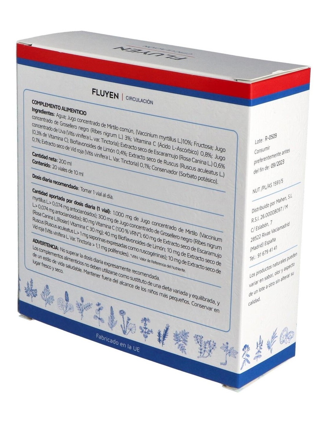 Ingredientes:Agua, jugo concentrado de mirtilo común (Vaccinium myrtillus L.), fructosa, jugo concentrado de grosellero negro (Ribes nigrum L.), vitamina C (ácido l-ascórbico), jugo concentrado de uva (Vitis vinifera L. var. Tinctoria), extracto seco de escaramujo (Rosa Canina L.) (vitamina C), bioflavoides de limón, extracto seco de ruscus (Ruscus aculeatus L.), extracto seco de vid roja (Vitis vinifera L var. Tinctoreria), conservador (sorbato potásico).Modo de empleo:Tomar 1 vial al día, preferentemente en ayunas. Presentación:Envase de 20 viales.