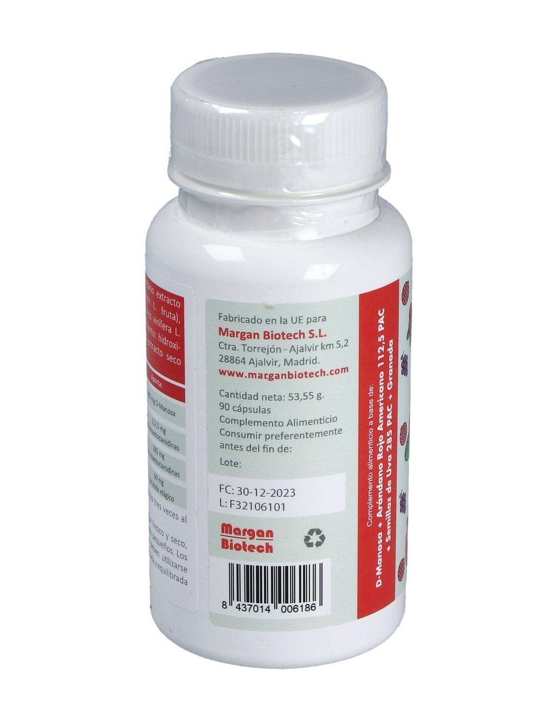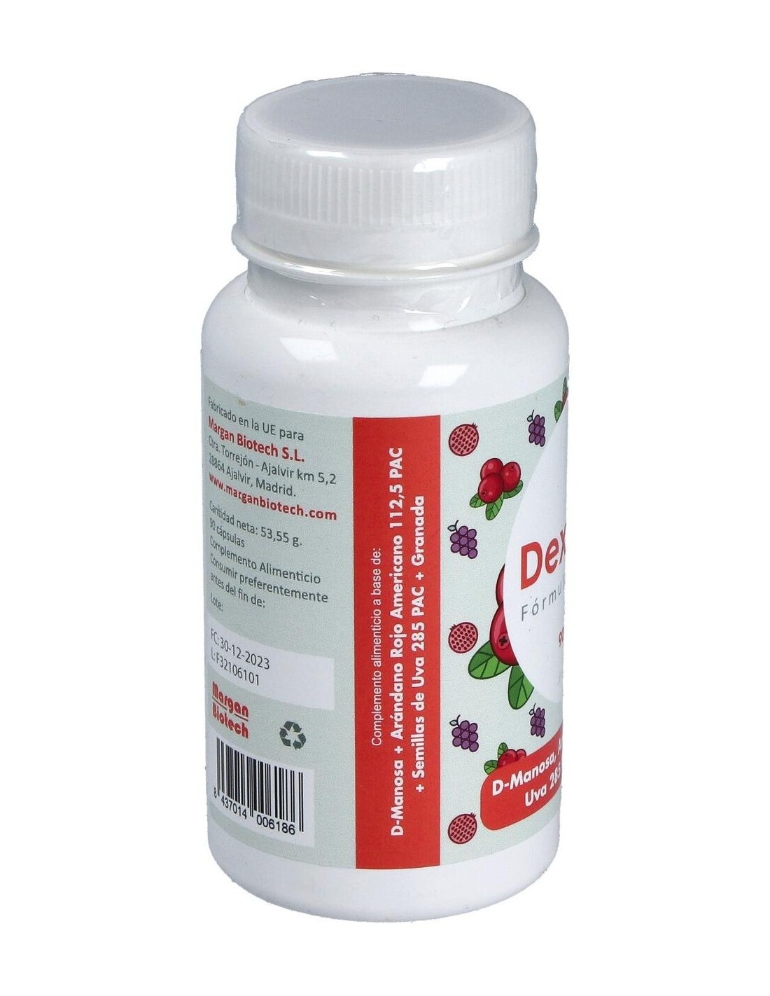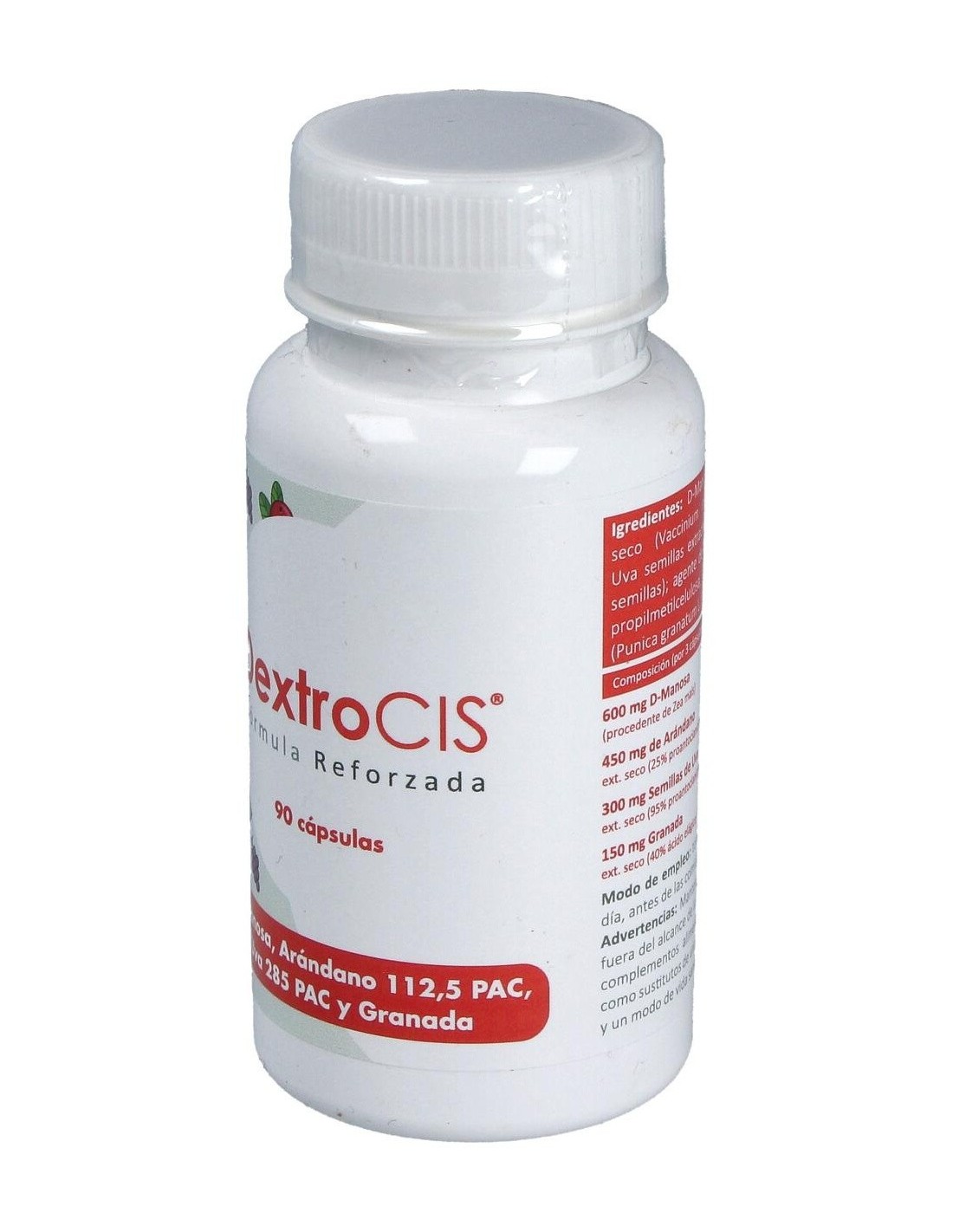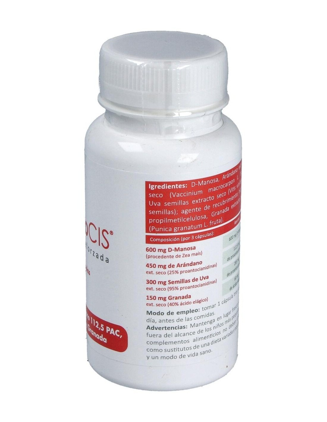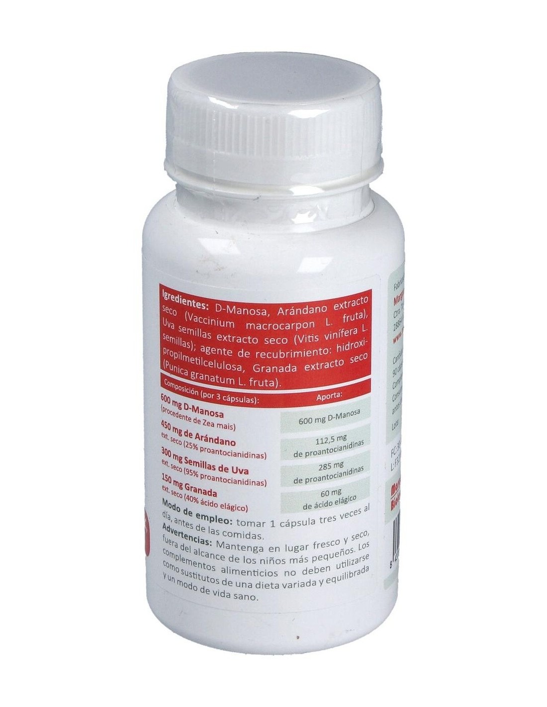 D-Manosa, extracto seco de semillas de Uva (Vitis Vinífera L. semillas): agente de recubrimiento: hidroxipropilmetilcelulosa: extracto seco de Granada (Punica granatum L. fruta): extracto seco de bayas de Arándano (Vaccinium myrtillus L. fruta).