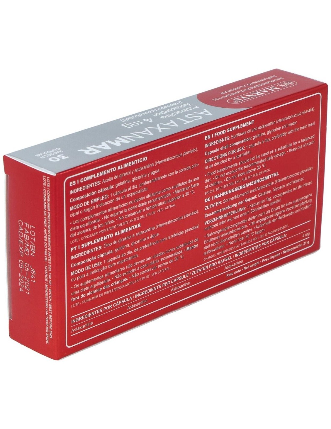 Astaxanmar 30Perlas de Marnys es un suplemento diseñado para personas interesadas en complementar su dieta con un producto que contiene astaxantina, un compuesto reconocido por su perfil antioxidante. Es adecuado para quienes buscan apoyar su bienestar general mediante ingredientes naturales.
