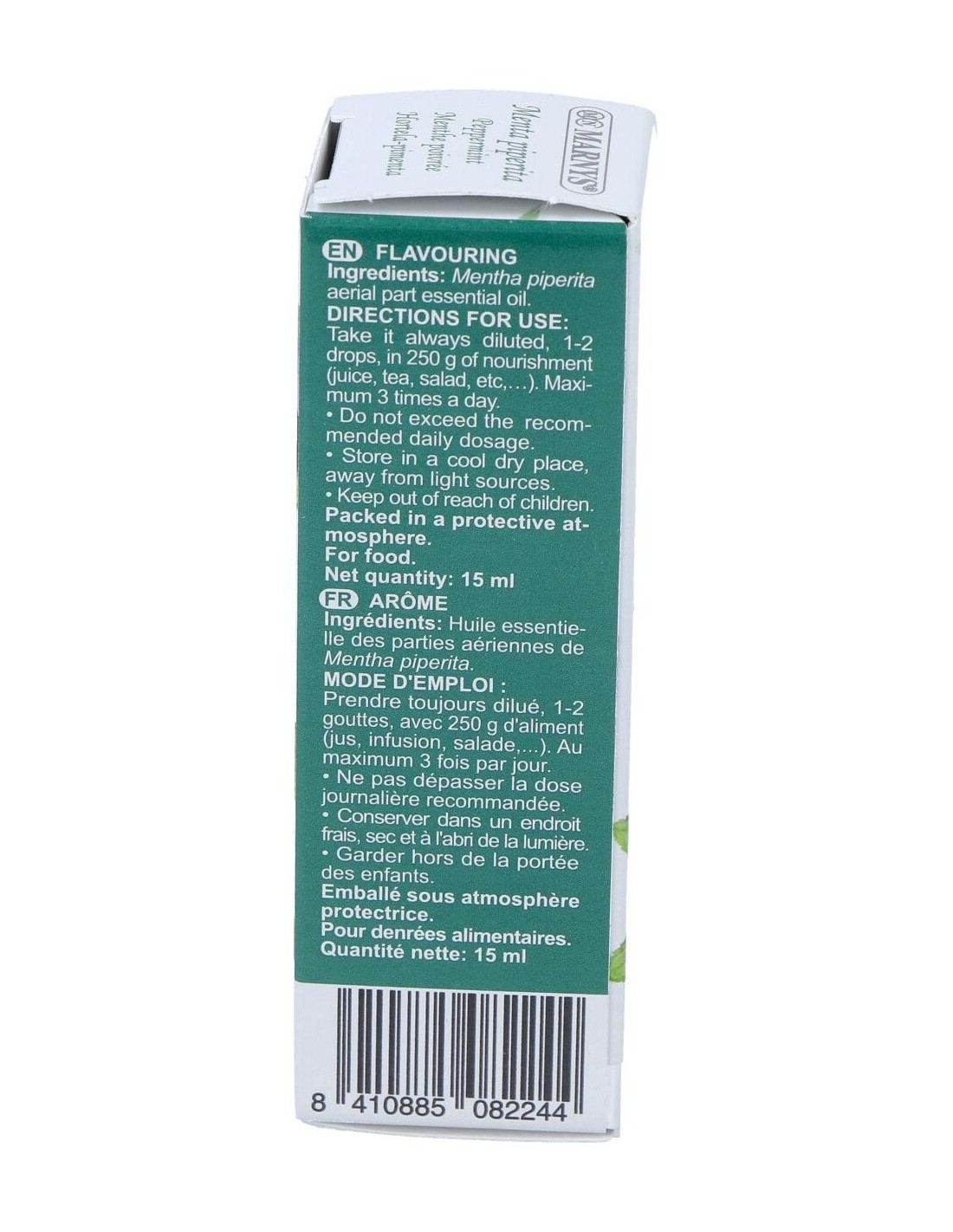 Este aceite esencial está elaborado con menta piperita de origen controlado, garantizando un producto puro y adecuado para su uso alimentario. Su envase compacto permite un almacenamiento seguro y práctico, manteniendo la frescura del aceite.